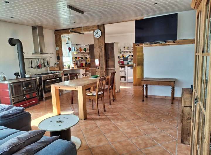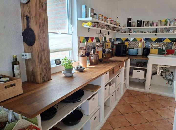 Eine Immobilie mit vielfältigen Nutzungsmöglichkeiten. Neben den 174,45 m² Wohnfläche kann man die vorhandenen 206 m² Nutzfläche ebenfalls zu Wohnflächen ausbauen und sie eventuell vermieten. Oder Sie nutzen diese Flächen, um dort ein Kleingewerbe etc. einzurichten. Es gibt 2 Hauseingänge, so dass eine Trennung von Privat und Geschäft möglich ist. Die momentan zum Wohnen genutzte Fläche umfasst eine große Wohnküche mit italienischem Kaminofen und einen Gas Kochherd. Die Einbau Küchenschränke bleiben im Haus. Ein großer Raum mit bodentiefen Fenstern wurde als Büro oder Hobbyraum genutzt. Er eignet sich aber auch hervorragend als großes, lichtdurchflutetes Wohnzimmer! Im Dachgeschoss gibt es vier Zimmer. Daneben befindet sich ein Bad mit Wanne und Dusche. Die Wände des Badezimmers sind z.T. im Hundertwasser-Stil gefliest.