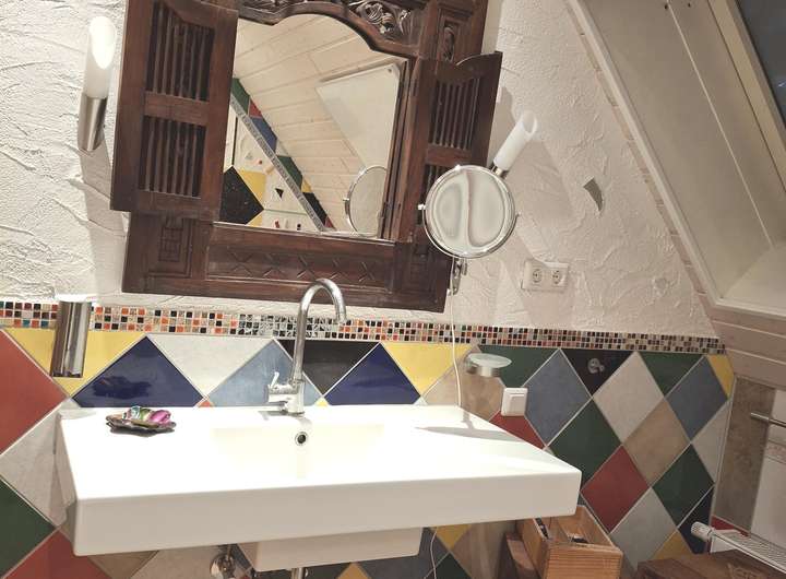 Bad mit Wanne und Dusche , Wände z.T. im Hundertwasserstil gefliest