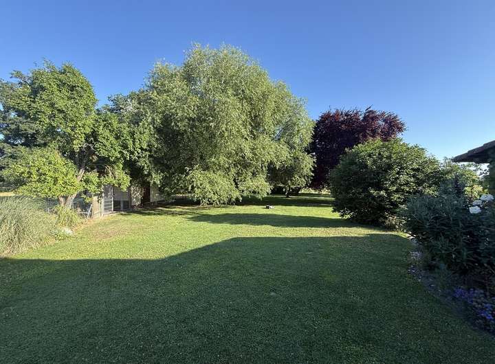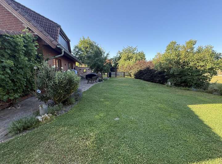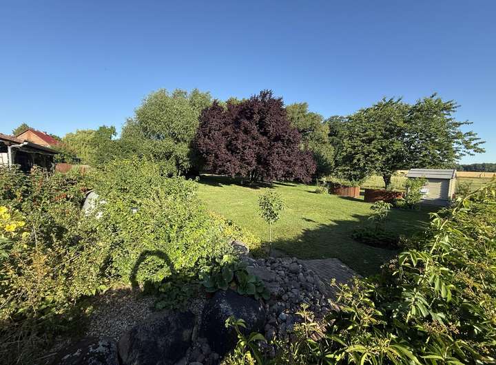Der Garten ist sehr gepflegt mit schönem Baumbestand, verschiedenen Beerensträuchern und mehreren Hochbeeten. Zwei kleine Gebäude können als Unterstellmöglichkeit genutzt werden.