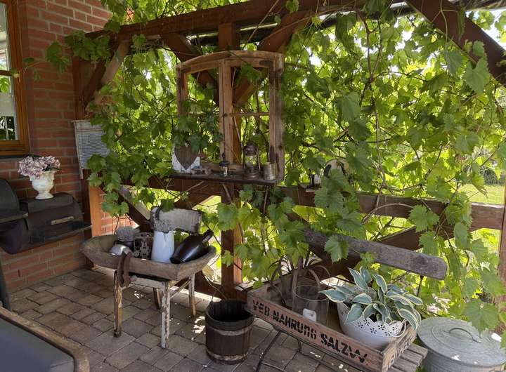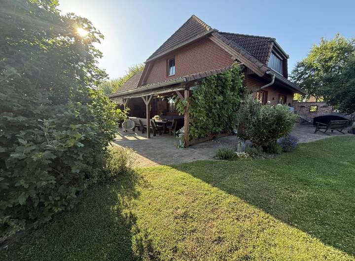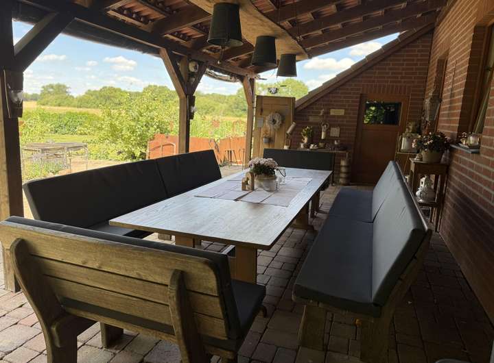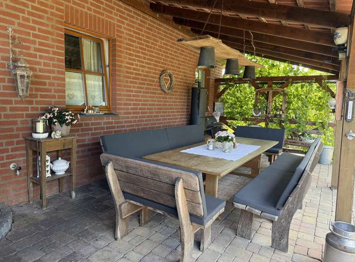 Die Sonne wandert von morgens bis abends um das Haus und unter der überdachten Terrasse mit Nordausrichtung lässt es sich auch bei Regen oder Hitze geschützt sitzen.