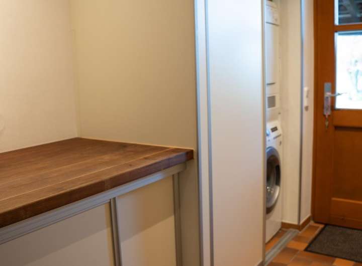 Eine Doppelgarage mit Werkstattbereich hat direkten Zugang zum Haus.