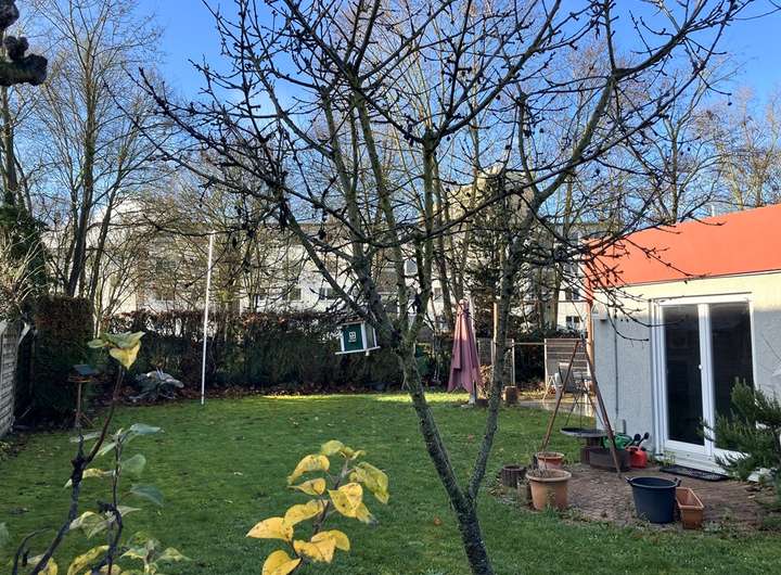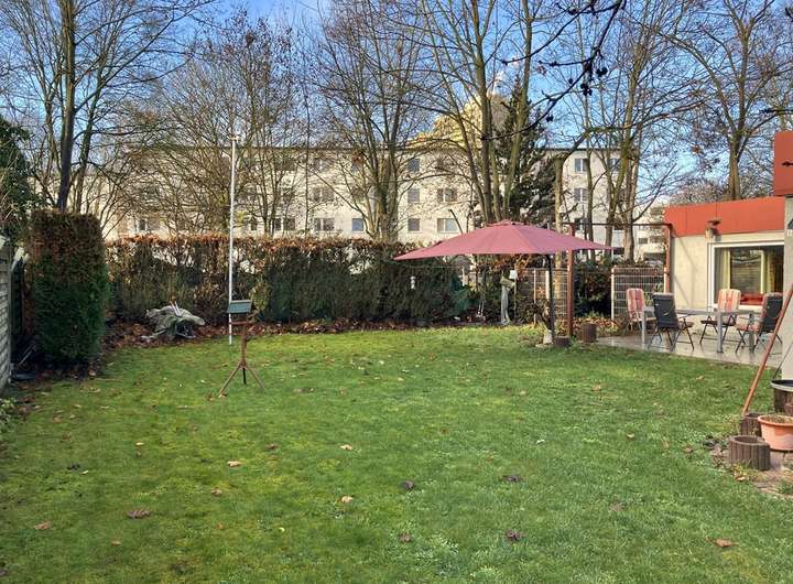 Ein besonderes Highlight des 560m² großen Grundstücks ist die geschützte und idyllische Lage in zweiter Reihe einer verkehrsberuhigten Seitenstraße. Mit gewachsenem Baumbestand, sichtgeschützten Hecken und einer Rasenfläche finden Sie hier eine wahre Oase mitten in der Stadt.