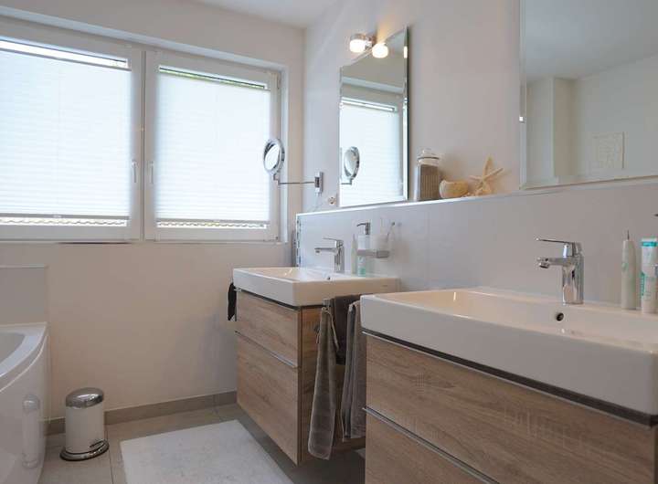 - Bad mit Wanne, bodentiefer Dusche und zwei Waschbecken