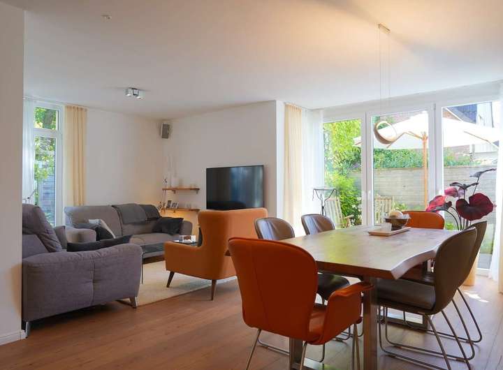 In dem hellen Wohn- und Essbereich mit bodentiefen Fenstern und angrenzender Terrasse wurden Holzdielen in Lärche verlegt. Die moderne neuwertige Einbauküche mit Lackfront in hellgrau matt lässt keine Wünsche offen. Hier haben Sie viel Platz zum Zaubern toller Gerichte für Ihre Lieben, und morgens können Sie Ihren Kaffee oder Tee direkt am Tresen genießen. Im Erdgeschoss finden Sie neben der Diele noch ein Gäste WC.