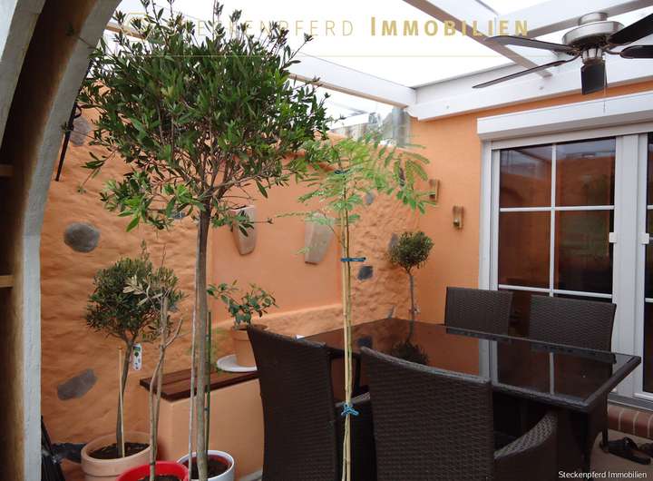 Ein besonderes Highlight dieser Immobilie ist der schön angelegte Garten mit einer großen, überdachten und uneinsehbaren Terrasse im Terrakotta-Stil. Dieser Bereich schafft ein außergewöhnliches Ambiente, lädt zum Entspannen ein und vermittelt pure Urlaubsatmosphäre – ob für gemütliche Abende, gesellige Runden oder ruhige Momente im Grünen.