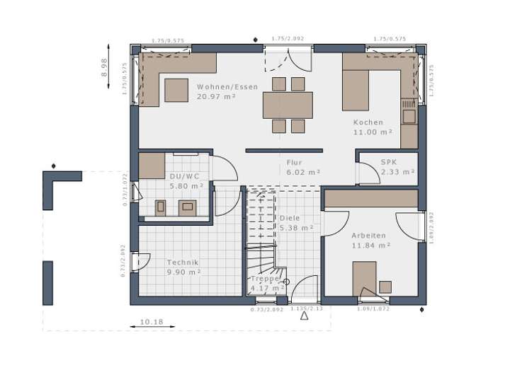 Der Grundriss des Hauses wird so gestaltet, dass er den Anforderungen Ihrer Familie gerecht wird. Große offene Wohnbereiche bieten ausreichend Platz für gemeinsame Aktivitäten und lassen viel natürliches Licht herein. Ein separates Spielzimmer oder ein Kinderzimmer sorgt dafür, dass Ihre Kinder sich entfalten können.