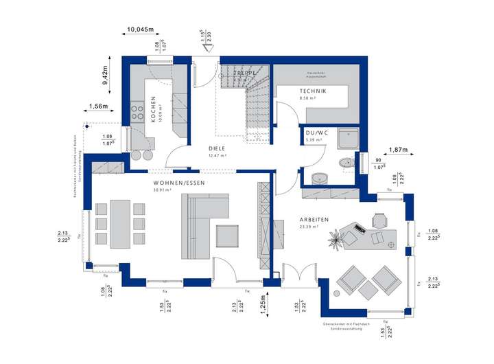 Die Ausbaustufe "Schlüsselfertig" sorgt dafür, dass der gesamte Bauprozess für Sie so komfortabel wie möglich verläuft. Vom Rohbau bis zur letzten Fliese kümmern wir uns um alles. Das bedeutet für Sie minimalen Aufwand und maximale Zufriedenheit. Darüber hinaus erfüllen wir höchste Anforderungen an Nachhaltigkeit und Qualität, sodass Sie sich nicht nur auf ein wunderschönes Zuhause freuen können, sondern auch von attraktiven Förderungen über die KfW profitieren.