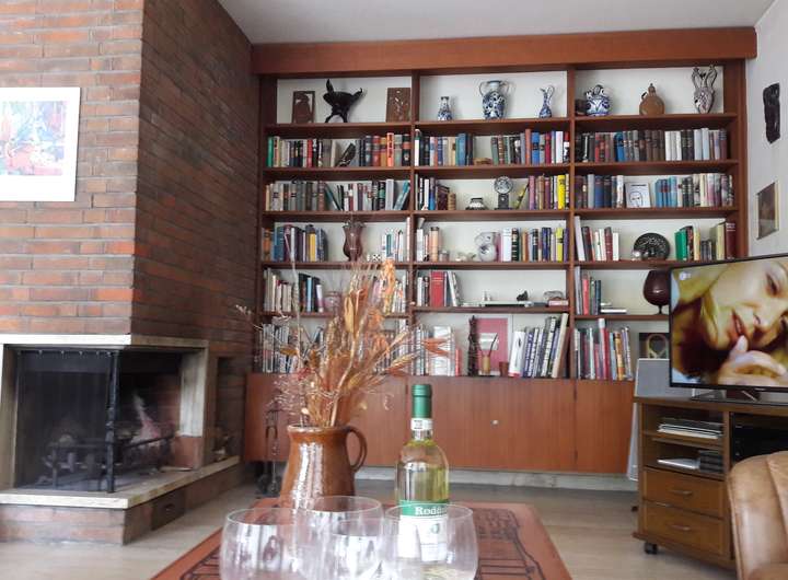 Im Wohnzimmer gibt es einen offenen Kamin.