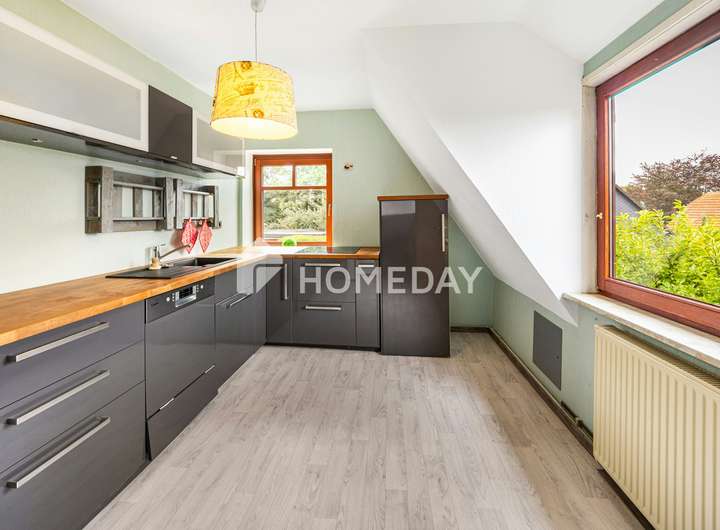 Die Ausstattung ist solide und gepflegt: Böden aus Fliesen, Laminat und Auslegware prägen das Ambiente, während doppelt verglaste Holzfenster und eine Öl-Zentralheizung aus dem Jahr 2012 für verlässliche Funktionalität sorgen. Die Heizungsanlagen werden regelmäßig durch eine Fachfirma gewartet. Eine gepflegte Einbauküche ergänzt den Wohnkomfort. Eine Solaranlage speist zusätzlich Strom ins Netz ein, der vergütet wird.