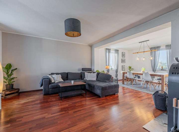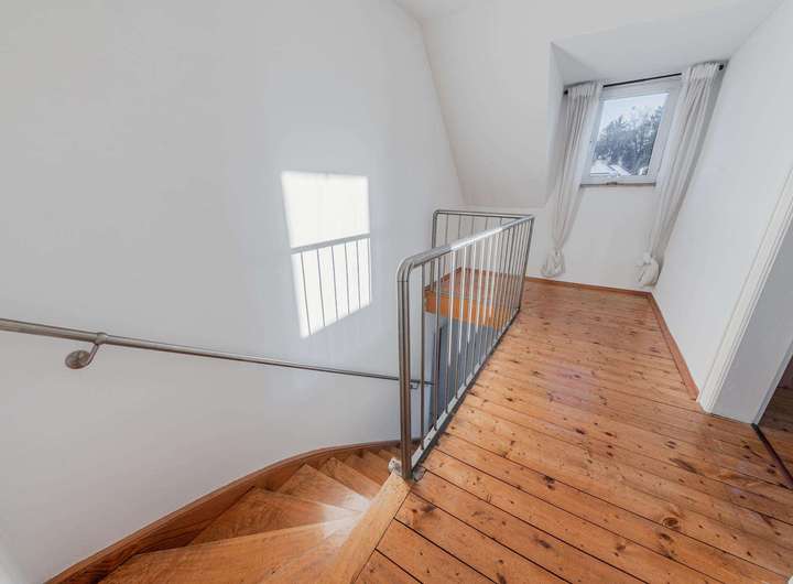 Das Erdgeschoss bildet mit dem offen gestalteten Wohn- und Essbereich den zentralen Lebensmittelpunkt. Die Öffnung zum Flur und Treppenhaus verleiht diesem Bereich eine besondere Weite und schafft ein angenehmes Raumgefühl über mehrere Ebenen hinweg. Der Kaminofen ist dabei nicht nur atmosphärischer Mittelpunkt, sondern prägt das Wohnen ganz wesentlich: Durch die offene Bauweise kann mit ihm nahezu das gesamte Treppenhaus und große Teile des Hauses beheizt werden.