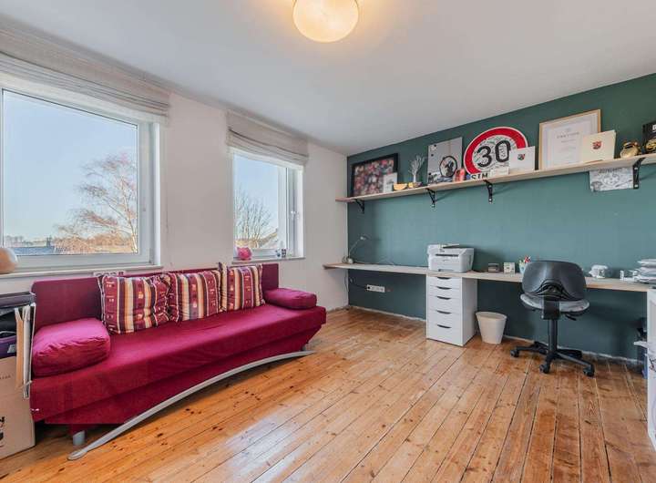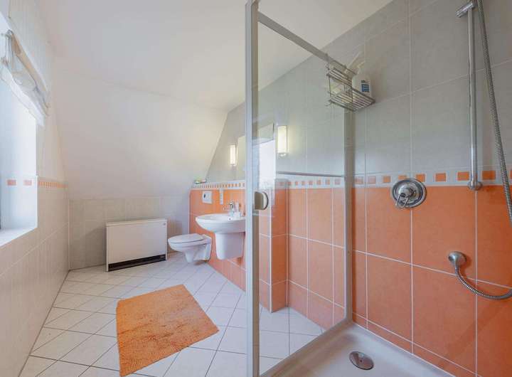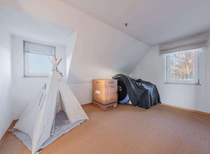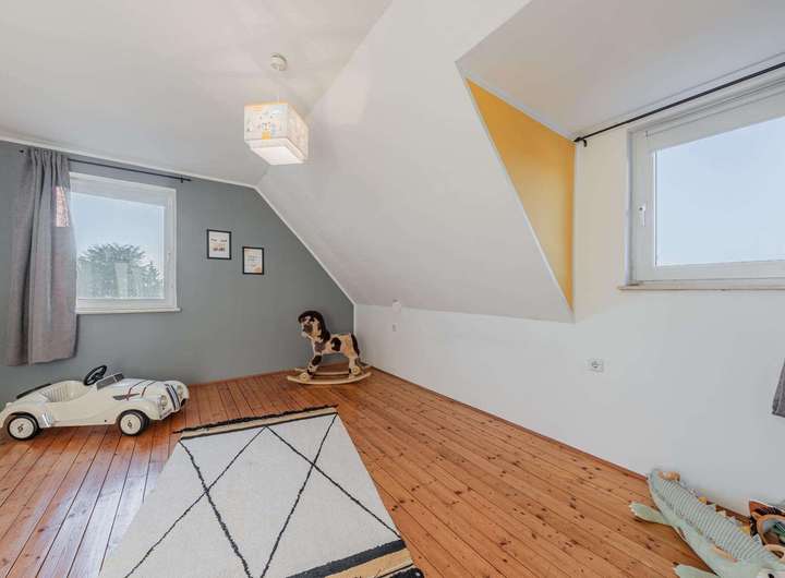 Das Dachgeschoss erweitert das Platzangebot um weitere Zimmer und eröffnet zusätzliche Gestaltungsfreiheit. Die teilweise als sogenannte „gefangene Räume“ ausgeführten Bereiche eignen sich besonders gut für zusammengehörige Nutzungen, etwa als gemeinsamer Kinderbereich, als Kombination aus Arbeits- und Gästezimmer oder als in sich abgeschlossene Einheit innerhalb des Hauses. Das auf dieser Ebene vorhandene Duschbad sorgt für zusätzliche Eigenständigkeit und trägt zu einem reibungslosen Ablauf im Alltag bei.