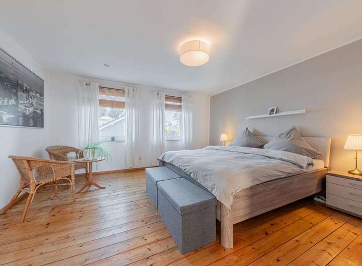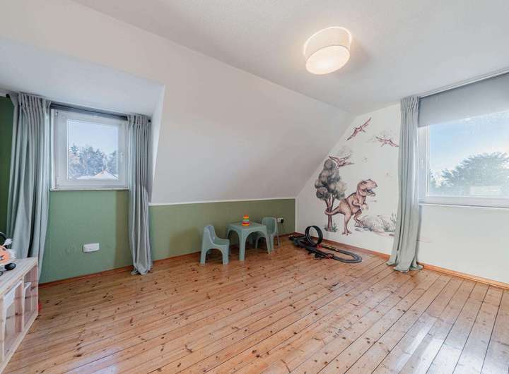 Im 1. Obergeschoss befinden sich die privaten Rückzugsräume. Das großzügige Schlafzimmer mit separater Ankleide sowie ein weiteres Zimmer bieten flexible Nutzungsmöglichkeiten – klassisch als Schlafräume oder kombiniert mit Arbeits- oder Hobbyfunktionen. Das Vollbad auf dieser Etage sorgt für kurze Wege und eine klare Trennung zwischen Wohnen und Ruhe.