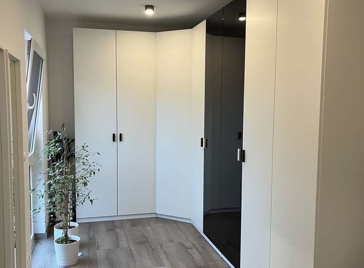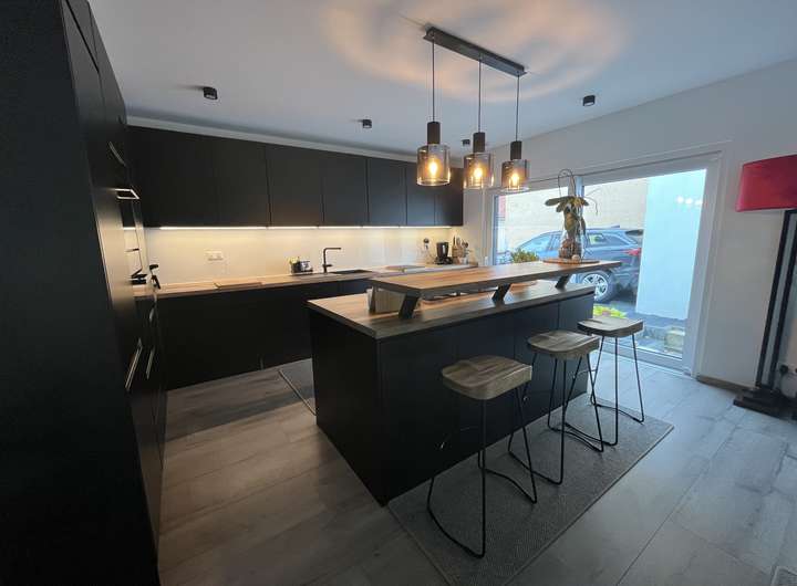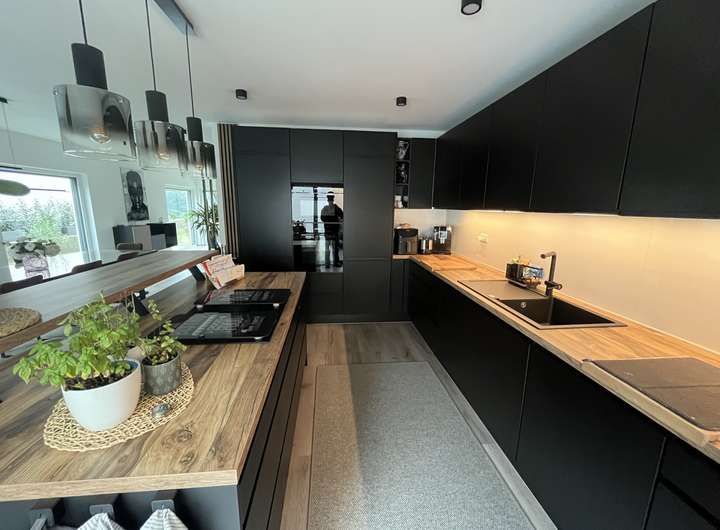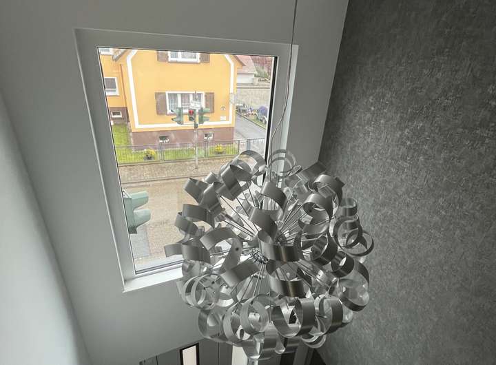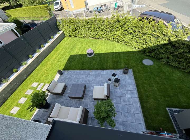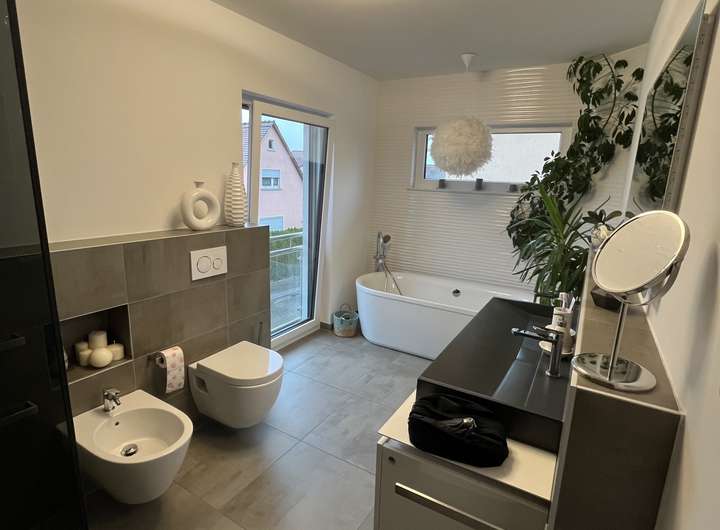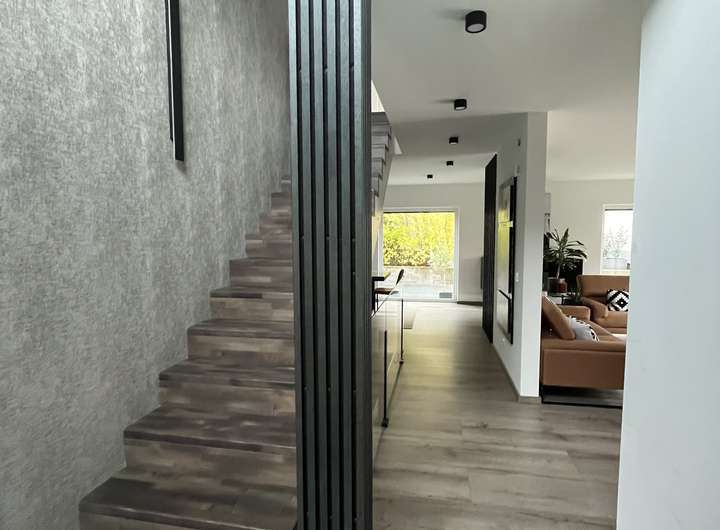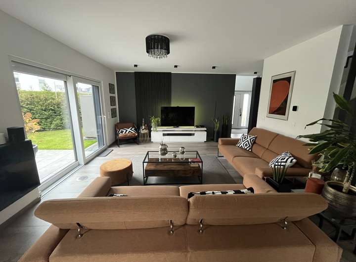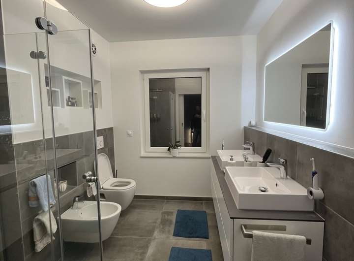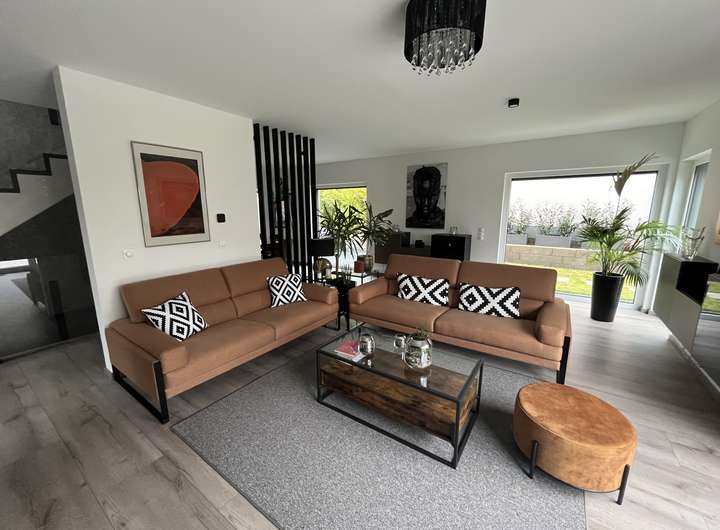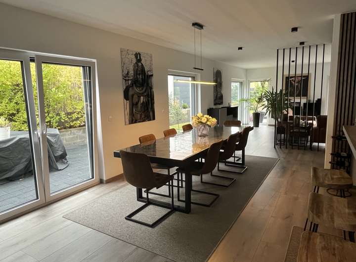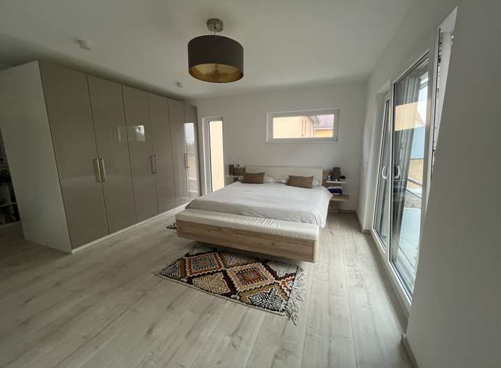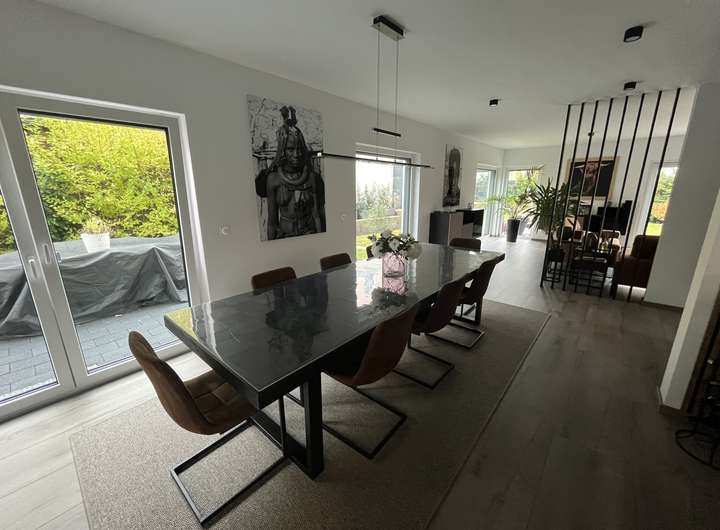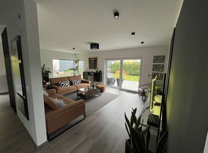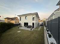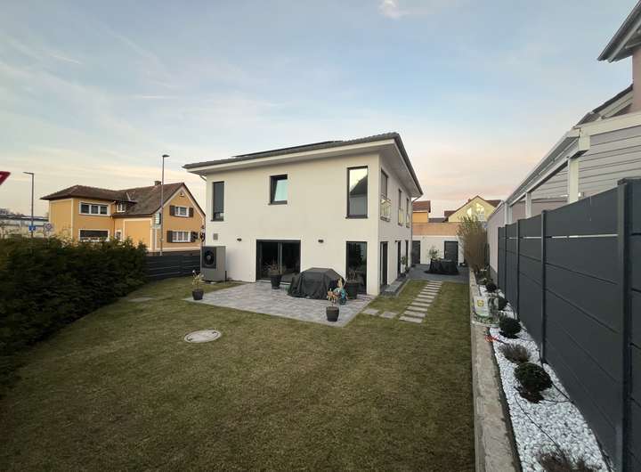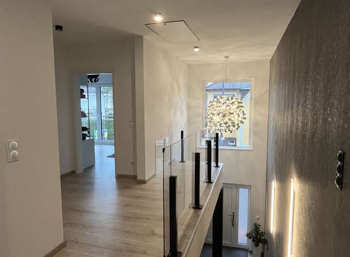 Die Böden sind mit edlem Holzlaminat verlegt, während die Bäder über Boden- und Wandbeläge aus Feinsteinzeug verfügen. Die Fenster sind vierfach verglast und sorgen für exzellente Wärmedämmung sowie erhöhte Ruhe im Innenbereich. Die Fußbodenheizung mit einer Buderus-Wärmepumpe garantiert hohe Energieeffizienz. Ein automatisches Lüftungssystem gewährleistet eine gleichmäßige Wärmeverteilung in allen Räumen. Das Heizungs- und Lüftungssystem verfügt über eine weitere zweijährige Garantie. Die gesamte Villa genießt noch 6 Jahre Herstellergarantie. Ein hochmodernes Smart-Home-System steuert zentral Rollos, Heizung, Beleuchtung und Hauptverbraucher und kann problemlos erweitert werden. Neben dem Stellplatz auf dem Grundstück verfügt die Villa über eine Garage mit einem weiteren Stellplatz und einem Raum für Gartengeräte. Der Garten ist gepflegt mit automatischem Bewässerungssystem, das gespeist wird aus einer 10 m³ Regenwasserzisterne. Die Immobilie ist bereits für den Glasfaser-Internetanschluss mit "Deutsche Glasfaser" vorbereitet, mit einer Geschwindigkeit bis zu 1000 GB.