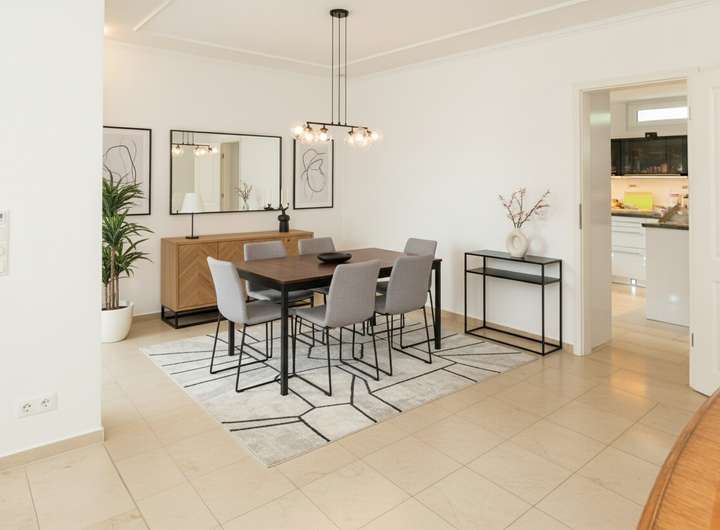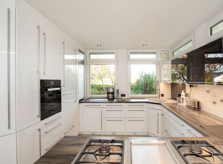 Schon beim Betreten überzeugt die großzügige Eingangsdiele, die in den offenen Wohn- und Essbereich übergeht. Hier sorgt ein Kamin für gemütliche Wärme und eine einladende Atmosphäre. Durch den direkten Zugang zur nach Süden ausgerichteten Terrasse wird ein harmonisches Zusammenspiel von Innen- und Außenbereich ermöglicht. Die separate Küche ist mit einem Gasherd und einem praktischen Frühstückstresen ausgestattet und somit ideal für gemeinsames Kochen und gesellige Stunden.