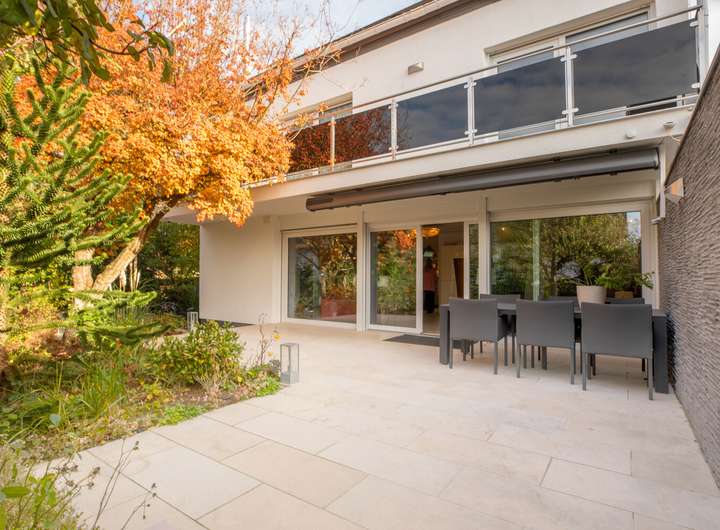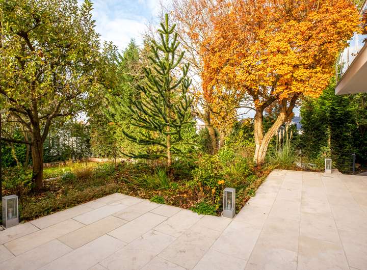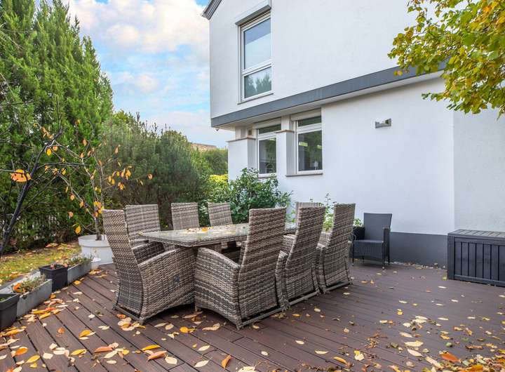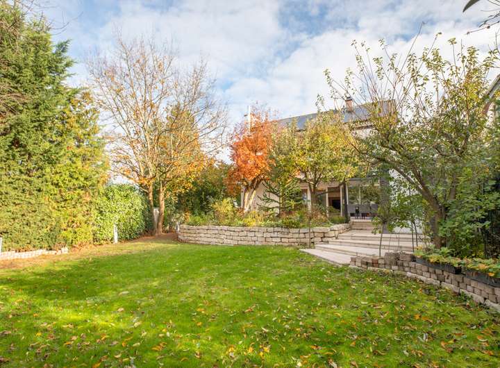 Der liebevoll angelegte Garten mit zwei geschützten Terrassen lädt zum Entspannen und Genießen ein. Eine große Garage mit Platz für zwei Fahrzeuge hintereinander sowie drei zusätzliche Außenstellplätze bieten hervorragende Parkmöglichkeiten.