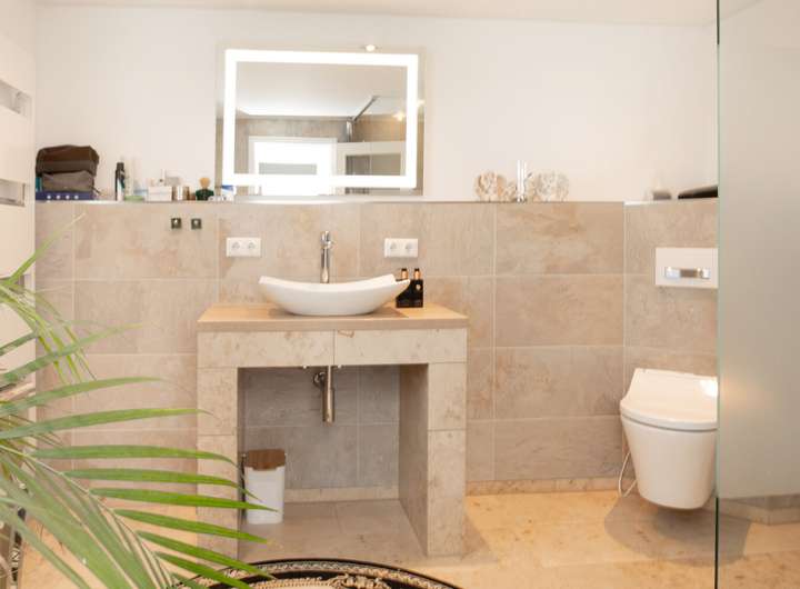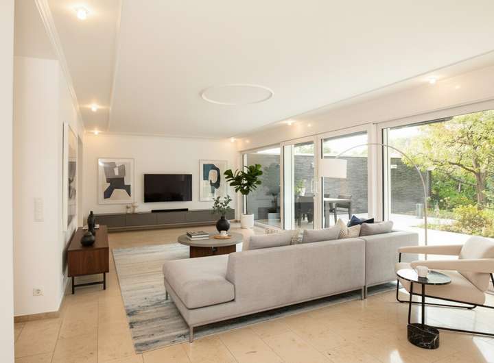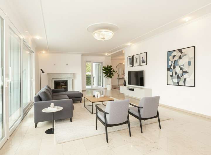 Im Untergeschoss befand sich ursprünglich ein Innenpool, der im Zuge der Sanierung geschlossen wurde. Heute wird dieser Bereich als stilvolles Homekino genutzt und bietet zusätzlich Platz für eine Sauna und ein Duschbad. Durch den separaten Zugang ließe sich das Untergeschoss bei Bedarf auch als Einliegerwohnung nutzen. Eine große Waschküche mit moderner Gasheizung ergänzt den Komfort auf dieser Ebene.