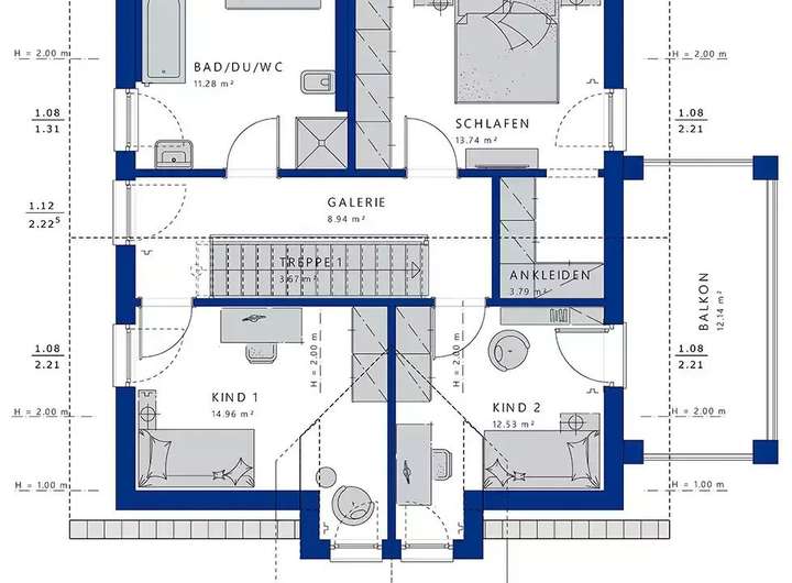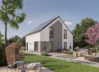 Eine charmante Außengestaltung und viel Platz im Innern: Dieses Fertighaus ist ein wahrer Wohntraum für eine vierköpfige Familie. Mit dem klassischen Satteldach - in diesem Planungsbeispiel dunkel eingedeckt - und der klaren Linienführung fügt es sich harmonisch in jedes Baugebiet ein, egal ob es sich auf dem Land oder im urbanen Umfeld befindet. Akzentuiert wird der weiß verputzte Hauptbaukörper von einem Querhaus mit Satteldach und einem Rechteckbalkon, der von filigranen Stützen getragen wird. Beide Architektur-Bauteile hüllen sich in einen sehr natürlich wirkenden Braunton. Der Balkon wird eingerahmt von einer transparenten Glasbrüstung. Sie betont nicht nur den modernen Charakter des Hauses, sondern erweist sich zudem noch als sehr langlebig und pflegeleicht. Abgerundet wird das elegante Design von bodentiefen Fensterelementen auf beiden Ebenen, die die Innenräume mit Tageslicht durchfluten. Dank der offenen Raumaufteilung im Erdgeschoss kann sich die Sonne in jeden Winkel ausbreiten. Bereits in der Diele bemerkt man das luftig-leichte Ambiente, das den Innenbereich prägt. Rechts neben dem Eingang liegt ein geräumiger Technikraum inklusive Abstellfläche für all die Dinge, die man nicht täglich benötigt. Links befindet sich ein flexibel nutzbares Zimmer. Auf den knapp 10 m² könnte ein ruhiges Büro, ein Gästezimmer oder ein zusätzliches Kinderzimmer entstehen. Später lässt sich hier auch das Schlafzimmer platzieren. Dank des Duschbads ist so ein barrierefreies Leben auf einer Ebene möglich. Über einen breiten Durchgang schließt sich der weitläufige Wohn-, Ess- und Kochbereich an, der ganz den gemeinschaftlichen Aktivitäten der Familie gewidmet ist. Privatsphäre finden die Bewohner im Dachgeschoss, das die Individualräume beherbergt. Die Dachschrägen verleihen den Räumen Gemütlichkeit. Die großzügige Wohnfläche von knapp 69 m² sorgt dabei für Bewegungsfreiraum und bietet ausreichend Stellmöglichkeiten für die Möbel. Zwei Kinderzimmer, ein Elternschlafraum mit offen angeschlossenem Ankleidebereich und ein großes Familienbad bieten alles, was eine vierköpfige Familie zum Leben und Wohlfühlen braucht.