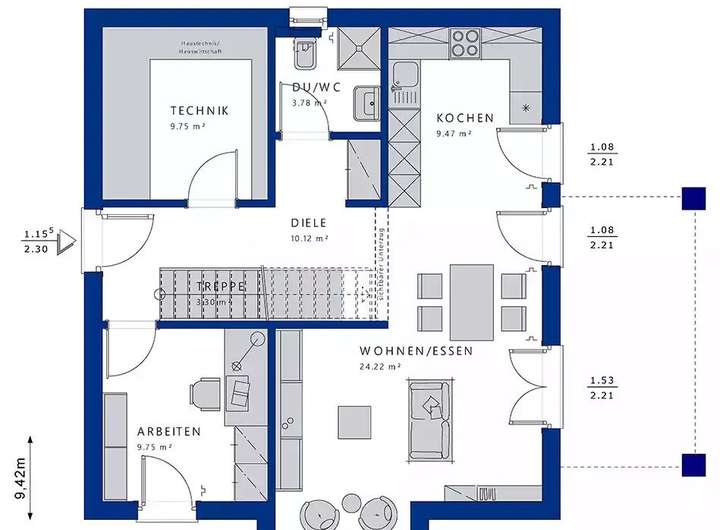 Das Haus ist als Effizienzhaus 40 geplant mit PV und Speicher.
