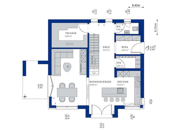 Elegant, modern und mit vielen frischen Ideen: So präsentiert sich dieses Fertighaus seinem Betrachter. Der quadratische Baukörper wird durch verschiedene Architektur-Features in Szene gesetzt. Blickfang auf der Gartenseite ist das Querhaus mit Pultdach, das einen interessanten Gegenpol zum klassischen Satteldach mit seinen weiten Dachüberständen bildet. Dank üppiger Verglasungen sorgt der Anbau in beiden Geschossen für ein großzügiges, lichtdurchflutetes Ambiente. An die Giebelseite des Hauses wurde eine designstarke Terrassenüberdachung angedockt. Unter ihr könnte beispielsweise ein gemütlicher Hängesitz Platz finden, in den sich an warmen Sommertagen nicht nur der Nachwuchs gern hineinlümmelt. Spritzige Akzente setzt die Farbgestaltung der Fassade: Der strahlend weiße Mineralputz wird kontrastiert mit dunkelgrauen Flächen. Wer mag, kann auch tiefer in den Farbkasten eintauchen. Wie wäre es beispielsweise mit einem sonnigen Gelb- oder einem natürlichen Braunton? Der Eingang liegt in diesem Planungsbeispiel auf der Giebelseite, er lässt sich aber auch auf die Traufseite verlegen. Der Grundriss ist perfekt auf den Tagesablauf einer vierköpfigen Familie abgestimmt. Offene Gemeinschaftsräume, gemütliche Privatbereiche für jeden Bewohner und multifunktionale Zonen vereinen sich zu einem harmonischen und alltagspraktischen Gesamtkonzept. Eine pfiffige Idee ist der Extra-Platz auf der Empore im Dachgeschoss, der sich vielseitig nutzen lässt. Die Bewohner können sich hier entweder ein luftiges Homeoffice mit Blick über den Garten oder eine schöne Spielecke für die Kinder mit Straßenteppich und Ritterburg einrichten. Hinzu kommen clevere Stauraumlösungen, von denen vor allem Familien bekanntlich nie genug haben können. So bietet der Windfang Stellfläche für einen großen Garderobenschrank, in dem sämtliche Jacken, Mäntel und Schuhe verschwinden. Größere Gegenstände wie die Skiausrüstung oder das Bobbycar der Kinder können im Technik- bzw. Hauswirtschaftsraum aufbewahrt werden. Und die Essensvorräte haben ihren Platz in der Speisekammer, die zwischen Eingang und Küche liegt. So kommt das Haus ganz ohne Keller aus.
