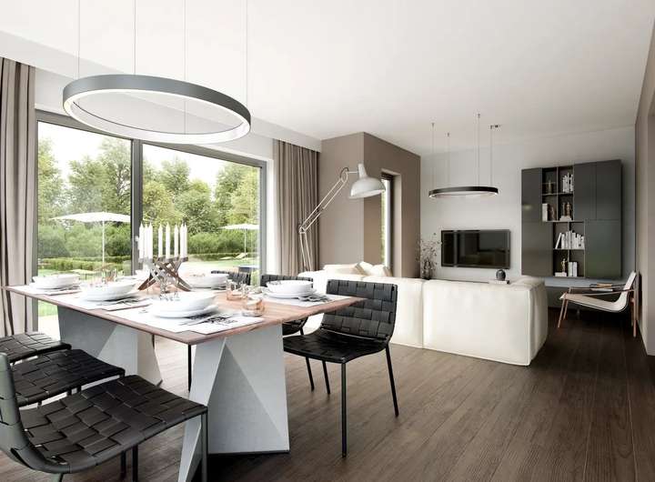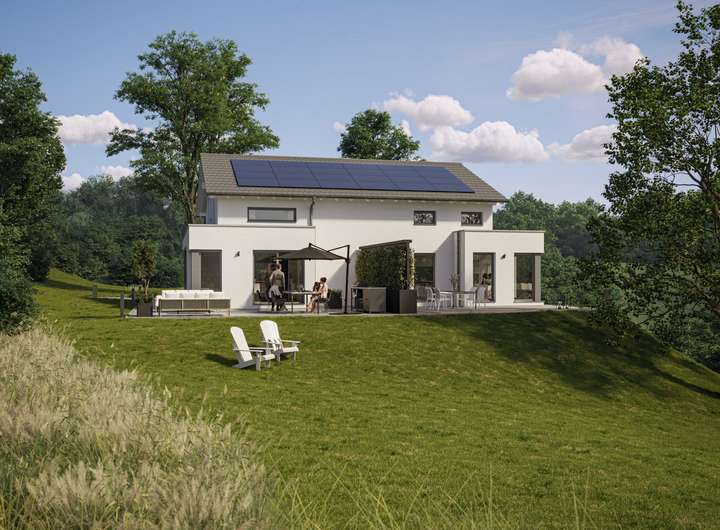 Wie harmonisch zwei getrennte Wohneinheiten unter einem gemeinsamen Dach vereint werden können, zeigt dieses moderne Zweifamilienhaus. Jede Familie besitzt dabei ihre eigene Haushälfte mit ihrem eigenen Zugang, die sie nach ihren individuellen Wünschen und Bedürfnissen gestalten kann. Attraktiv sind die beiden Übereck-Erker mit Flachdach, die die Wohnfläche im Innern um ein sonniges Plätzchen erweitern. Einer davon verlängert sich in eine praktische Eingangsüberdachung. Auf beiden Ebenen sorgen großzügige, teilweise bodentief ausgeführte Fensterflächen für ein luftig-leichtes Wohnambiente. Gekrönt wird das Fertighaus von einem flach geneigten Satteldach mit kurzen Dachüberständen. Damit passt es sich perfekt in jedes Umfeld ein - egal ob es sich um ein Neubaugebiet oder um eine gewachsene Siedlung handelt. Damit beiden Parteien möglichst viel Privatsphäre zukommt, befinden sich die Eingänge auf verschiedenen Seiten des Hauses. Das Raumprogramm ist in jeder Wohneinheit im Wesentlichen gleich. Empfangen werden Bewohner und Besucher von einer geräumigen Diele, an die sich das Gäste-WC sowie eine kleine Abstellkammer anschließen. Die offen angelegten Gemeinschaftsräume erstrecken sich über die Gartenseite. Der lichtdurchflutete Erker ist dabei wie geschaffen für einen großen Esstisch. Schon beim Frühstück kann man den Blick in den Garten genießen, der von der Morgensonne in ein goldenes Licht getaucht wird. In die Raumecke darf sich gerne die gemütliche Couchlandschaft schmiegen, auf der am Abend gemeinsam entspannt wird. Eine kompakte, halbgewendelte Treppe führt hinauf zu den privaten Ruhe- und Rückzugsbereichen. Das Dachgeschoss steht dabei mit einem Kniestock von 1,60 m dem Platzangebot des Erdgeschosses in nichts nach. Es gliedert sich jeweils in zwei großzügig dimensionierte Schlafzimmer, die sich ein Wellnessbad mit Wanne und Dusche teilen. Die Haus- und Heiztechnik, die bei Bien-Zenker im Standard aus der energieeffizienten und ökologischen Wohlfühl-Klima-Heizung+ besteht, findet in einem gemeinsamen Technikraum Platz. Betreten wird er von außen über eine Nebentür.