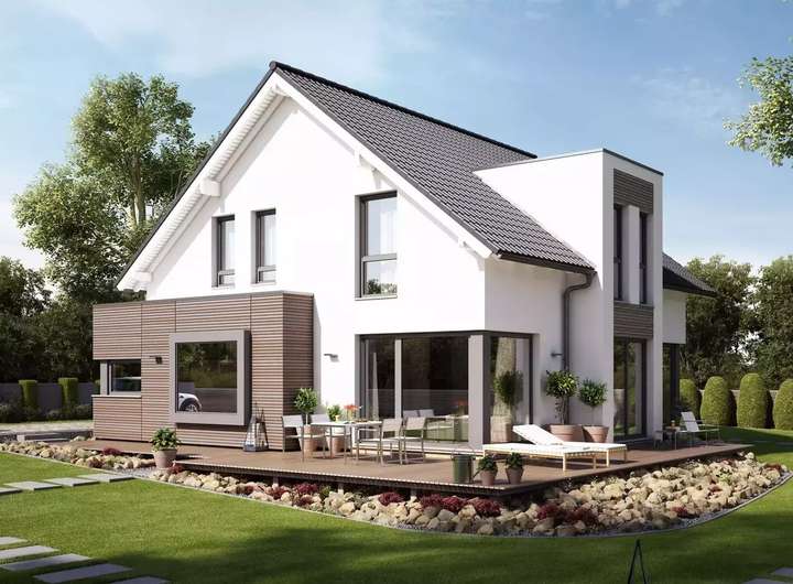 Dieses Einfamilienhaus punktet nicht nur mit seiner spannenden architektonischen Gestaltung, sondern auch mit seinem cleveren Raumkonzept. Im Zentrum des Entwurfs steht ein quadratischer Baukörper, an den sich ein Übereck-Erker und ein Querhaus anschließen. Mit seinem Flachdach steht Letzteres im Kontrast zum klassischen Satteldach des Haupthauses. Ausdrucksstarke Akzente setzen zudem die partiellen Holzverschalungen an den beiden Architektur-Bauteilen: Sie verleihen dem Fertighaus Gemütlichkeit und schlagen zugleich einen Bogen zur nachhaltigen Bauweise. Denn die Konstruktion hinter der schicken Fassade besteht zum großen Teil aus dem Naturbaustoff Holz, der im Innern ein angenehmes und gesundes Raumklima schafft. Ergänzt wird das Architekturkonzept von großzügigen Glasflächen in verschiedenen Formaten. Ins Auge fallen insbesondere die raumhohen Übereck-Verglasungen auf der Gartenseite, die die Grenzen zwischen innen und außen verschwimmen lassen. Der Eingang befindet sich auf der Giebelseite. Hinter der Haustür findet man sich in einer geräumigen Diele wieder, an die sich rechts die Garderobe, das Gäste-WC und der Technikraum anschließen. Links liegen ein helles Homeoffice, das wahlweise auch als Gäste- oder zusätzliches Kinderzimmer genutzt werden kann, sowie die Speisekammer. Geradeaus mündet die Diele in den lichtdurchfluteten Wohn-, Koch- und Essbereich, der rund die Hälfte der Erdgeschossfläche einnimmt. Große Freiflächen verleihen ihm einen luftig-leichten Charakter. Der Wohnbereich wurde über Eck angeordnet, sodass er nicht gleich vom Eingang aus eingesehen werden kann. Besonders praktisch ist der zweite Zugang zur Diele. Über eine halbgewendelte Treppe gelangt man in das Dachgeschoss, das sich als wahrer Wohntraum für eine Familie mit zwei Kindern entpuppt. Für den Nachwuchs stehen zwei gleich große Kinderzimmer bereit. So werden Streitigkeiten von vornherein vermieden. Ein separates Kinderbad mit Dusche sorgt für einen entspannten Start in den Tag. Die Eltern können sich über ein großes Schlafzimmer mit integrierter Ankleide und angrenzendem Wellnessbad freuen.