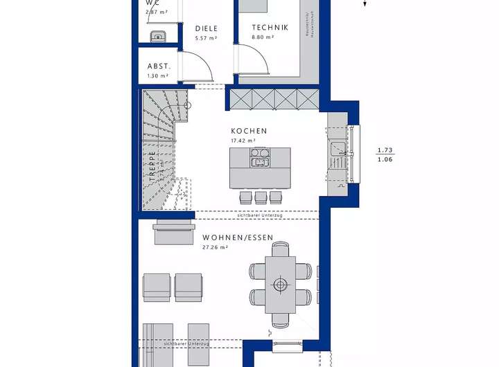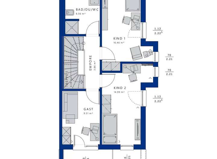 Eine herrschaftliche Villa für zwei Familien: Dieses Fertighaus lässt bereits von außen erahnen, wie großzügig und komfortabel es im Innern zugeht. Die Basis des Entwurfs bildet ein kubischer Baukörper mit sehr flach geneigtem Pultdach, an den zwei Rechteck-Erker mit Flachdach sowie ein üppig verglaster Wintergarten mit Terrassenpergola angedockt wurden. Zwei Balkone erweitern die Wohnfläche jeder Gebäudehälfte zusätzlich um sonnige Relaxbereiche in luftiger Höhe. Umrahmt werden sie von filigranen Glasbrüstungen, die den modernen Charakter des Hauses unterstreichen. Um die Privatsphäre beider Parteien zu wahren, sind die Freisitze mittels Wandsegmenten voneinander abgetrennt. Die Fassade hüllt sich in einen strahlend weißen Mineralputz, der von dunkelgrauen Flächen akzentuiert wird. Die Raumaufteilung ist auf den turbulenten Familienalltag einer vierköpfigen Familie ausgerichtet. Damit den Wohnräumen mehr Platz zukommt, wurde auf unnötige Verkehrswege verzichtet. So gibt es beispielsweise kein eigenes Treppenhaus. Stattdessen integriert sich der Aufgang in das Obergeschoss harmonisch in den Kochbereich. Die Küche avanciert damit zum zentralen Treffpunkt: Wer das Haus verlässt und wer nach Hause kommt, wird erst einmal einen Stopp an der gemütlichen Theke einlegen. Für einen Plausch bei einer Tasse Kaffee, Tee oder Kakao ist immer Zeit! Entspannt wird sich auf der großen Couch, die einen gebührenden Stellplatz im Wintergarten-Erker findet. Von hier ist es nur einen Katzensprung auf die Terrasse, die im Sommer zum zweiten Wohnzimmer wird. Ergänzt wird das Raumangebot durch ein Gäste-WC, einer Abstellkammer für all die Dinge, die man nicht täglich benötigt, sowie einem Arbeitszimmer. Der Technikraum wandert in den Keller! Das Obergeschoss ist für den Nachwuchs reserviert: Zwei interessant geschnittene Kinderzimmer mit sonnigem Erker-Platz, ein Gästezimmer und ein Bad mit Dusche und WC bieten Luxus pur. Die Eltern beziehen ihr Reich im Dachgeschoss: Die Treppe führt direkt zum großen Schlafzimmer mit en suite Ankleide und Wellnessbad. Ein echtes Highlight ist die Dachterrasse mit Weitblick über die Umgebung.