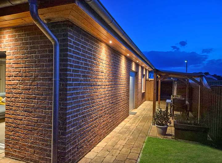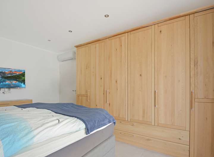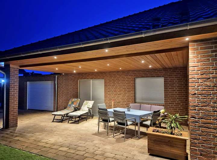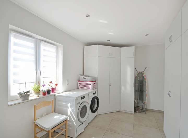 LED-Strahler finden Sie im ganzen Haus, sie beleuchten auch den kompletten Außenbereich des Hauses. Das ist schick und energiesparend zugleich. Ihre Türklingel ist mit einer Sprechanlage und Bildschirm gekoppelt, so erkennen Sie immer gleich wer Sie besucht. Glasfaser liegt im Haus, Fern können Sie alternativ auch über die installierte Schüssel sehen. Ein Gartenbrunnen und der Mähroboter helfen bei der Gartenarbeit. Arbeitsgeräte finden ihren Platz in der massiven Gartenhütte aus Lärchenholz. Für das Holz gibt es Unterstände und falls gewünscht, lassen sich in der großen Garage nicht nur die E-Autos parken und aufladen, sondern auch eine kleine Werkstatt einrichten. Der Einbau des zweiten Sektionaltors zum Garten ist ein echter Gewinn.