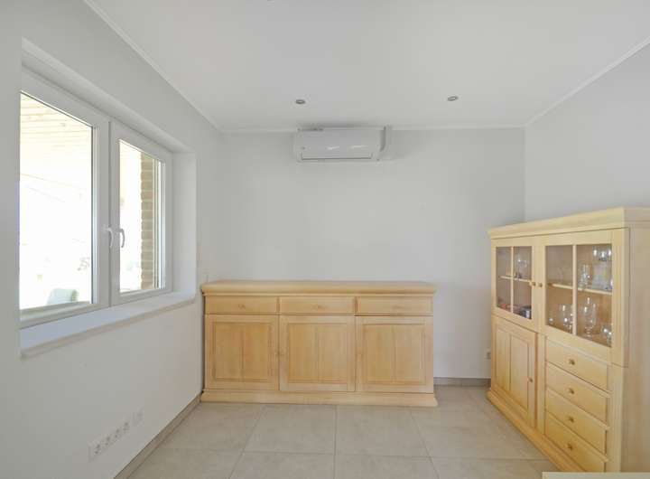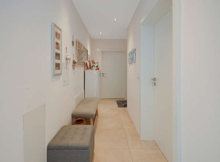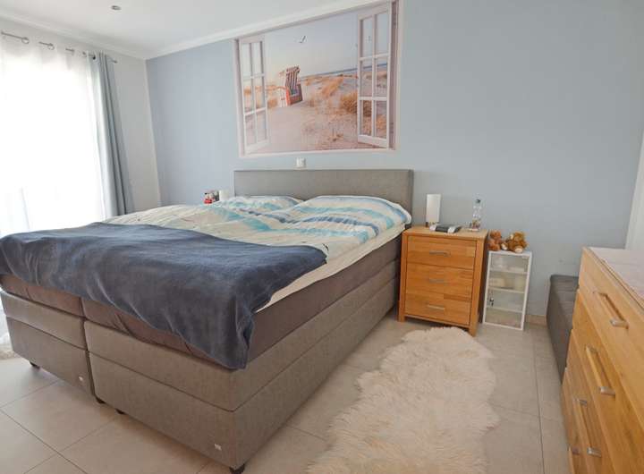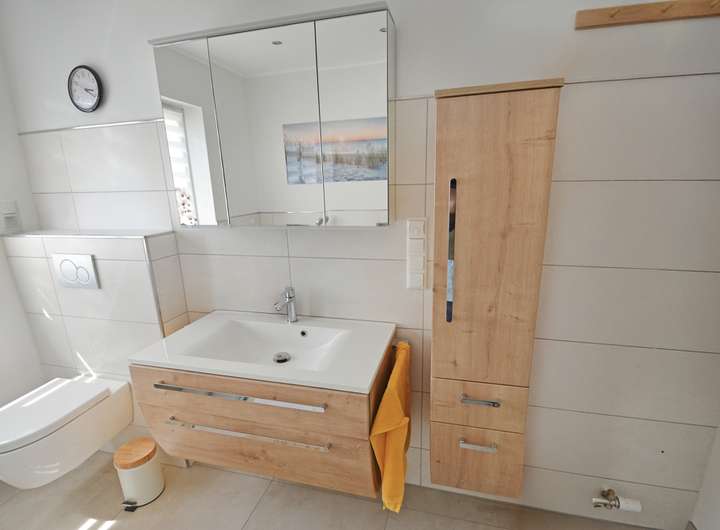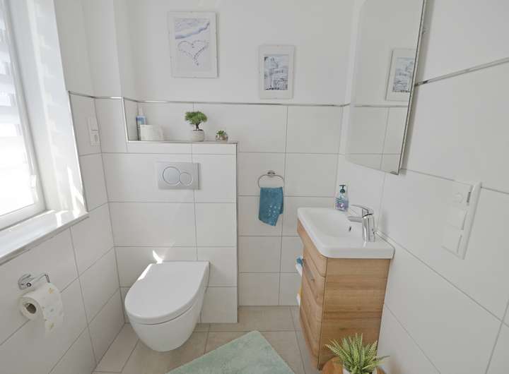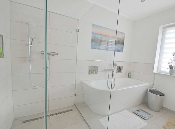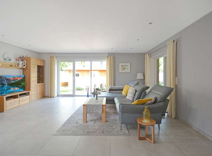 Geheizt wird mit moderner Gas-Brennwerttechnik in Kombination mit Solarmodulen zur Warmwasserbereitung, natürlich ist im ganzen Haus eine Fußbodenheizung verlegt. Die gute Isolierung gewährleistet niedrigste Energiekosten (ca. 4400 kWh Gas/Jahr, monatliche Heizkosten ca. 55,- €). Elektrische Rollläden sind selbstverständlich, die eingebauten Fliegengitter ein zusätzliches Plus. Für die ganz warme Jahreszeit ist im Schlafzimmer und Büro/Wohnzimmer eine Klimaanlage verbaut. Großformatige, schicke Fliesen sind durchgängig verlegt. Sie sind sehr pflegeleicht, besonders wenn Sie Kinder oder Haustiere haben bzw. Allergiker sind. Die wertigen Hensel-Innentüren zeichnen sich durch eine klare, moderne Optik aus. Überwiegend sind sie einen Meter breit, ideal wenn Sie auf eine Gehhilfe oder Rolli angewiesen sind. Die edle Badausstattung mit bodentiefer Dusche, eleganter Badewanne und modernen Schränken werden Sie mögen und die höher angebrachten Toiletten nicht nur im Alter schätzen.