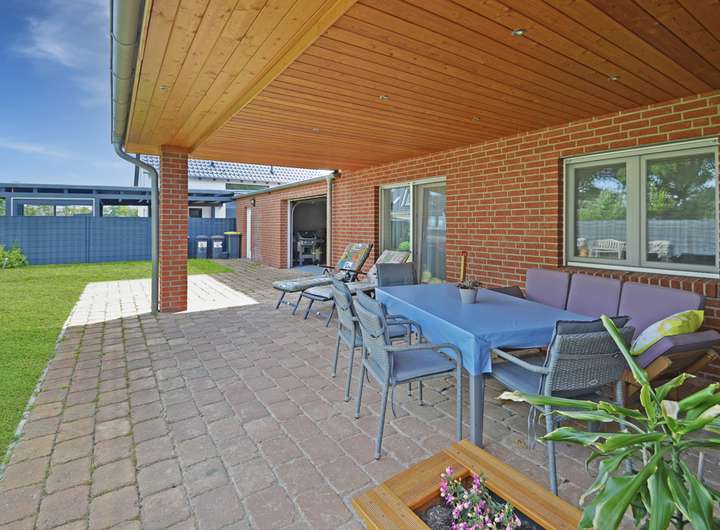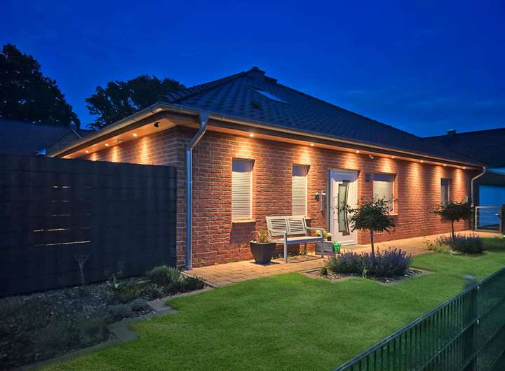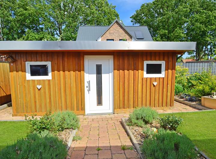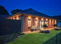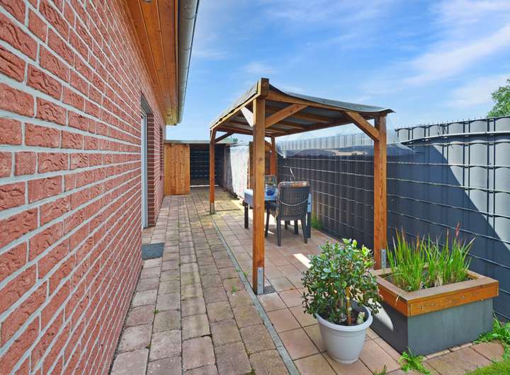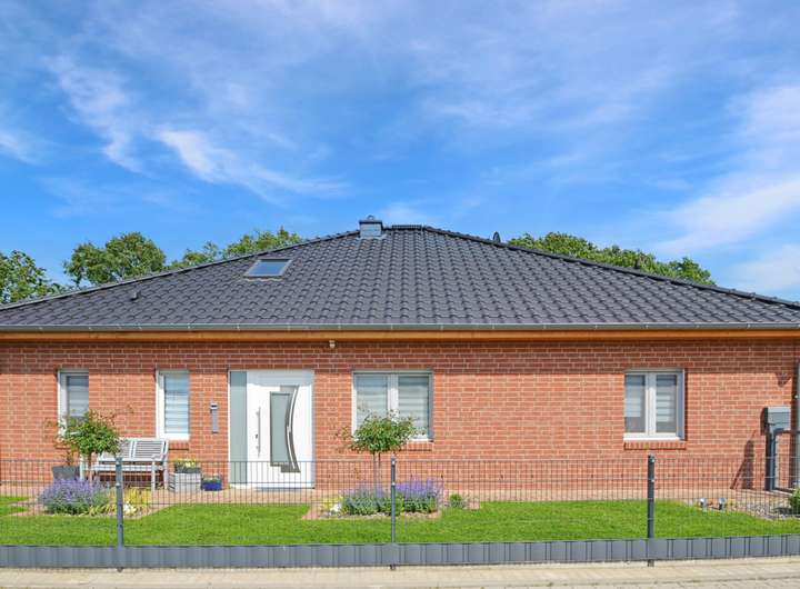 Willkommen in diesem wunderschönen Klinker-Bungalow, der durch seine moderne Ausstattung und durchdachte Raumaufteilung besticht. Das Haus ist barrierefrei gestaltet und bietet somit komfortables Wohnen für alle Generationen und Menschen mit Handicap. Hier fehlt es an NICHTS! In der modernen Küche mit vielen Abstell-, und Arbeitsflächen findet auch noch der Frühstückstisch bequem Platz. Den sich anschließenden Vorratsraum werden Sie besonders schätzen. Die gute Stube mit Zugang zur überdachten Terrasse, ist lichtdurchflutet und zeigt mit ca. 41 m² wahre Größe. Für behagliche Stunden sorgt ein Kaminofen. Das Büro, alternativ ein Gäste-, bzw. Kinderzimmer, schließt sich dort an. Über den schicken Flur betreten Sie das gemütliche Schlafzimmer, ebenfalls mit Zutritt zur Terrasse und angemessener Fläche für Ihre Kleiderschränke. Im Bad ist an alles gedacht - ganz gleich, ob Sie gern duschen oder in der Badewanne entspannen möchten. Das Gäste-WC bietet zusätzlichen Komfort für Ihre Besucher. Endlich einen Hauswirtschaftsraum mit ansprechenden Maßen - viel Platz für Stauraum und Hausarbeit, das erleichtert den Alltag. Potential für individuelle Erweiterungen steht als Ausbaureserve im Dachgeschoss bereit. Alternativ können Sie die Küche in die ca. 41 m² große Stube verlegen und haben so einen weiteren Schlafraum mit kleiner Ankleide. -"Unbezahlbar" ist die Doppelgarage mit direktem Zugang zum Haus. Dessen Zufahrt bietet zudem noch zwei weitere Außenstellplätze. Ein wahres Gartenparadies ist schon für Sie angelegt, schöne Beete, gemütliche Plätzchen zum Entspannen und Grillen, ein massives Gartenhaus und vieles mehr gibt es zu entdecken. Die überdachte ca. 26 m² Hauptterrasse lässt sich fast ganzjährig nutzen und mit der Rundumbeleuchtung wird's in den Abendstunden richtig kuschelig.