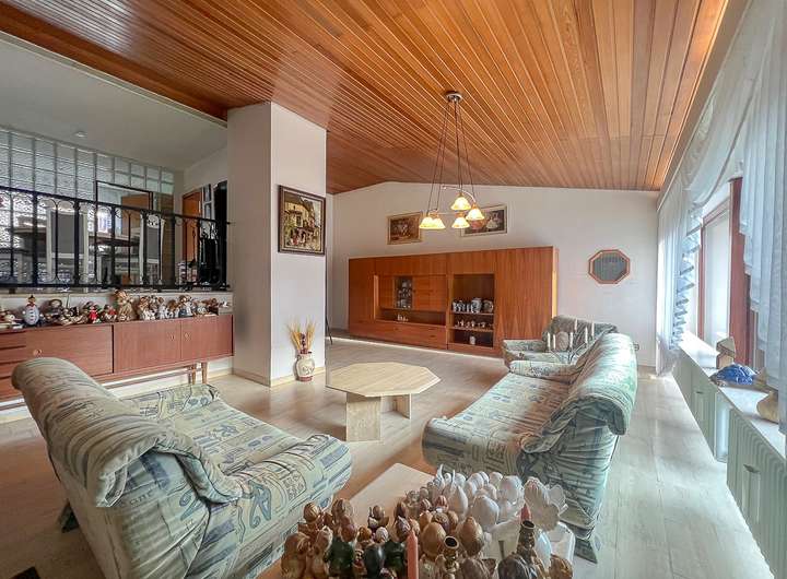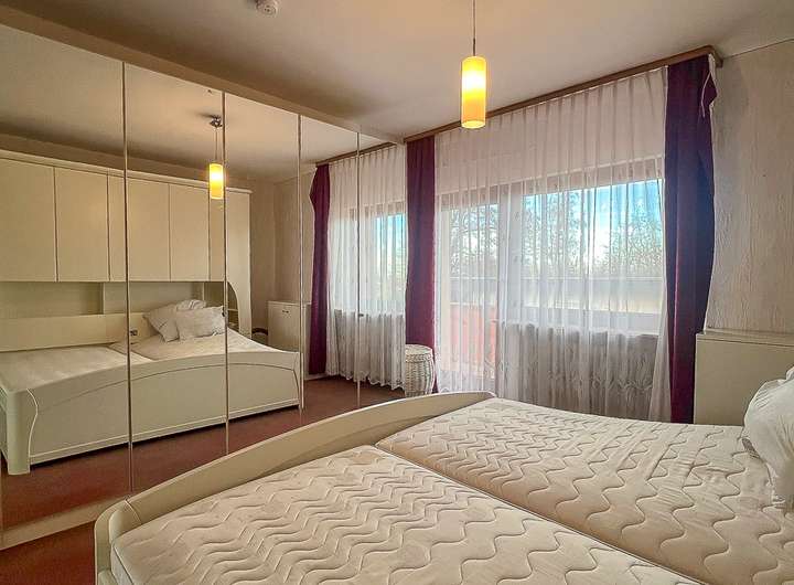 Die insgesamt 205 m² Wohnfläche verteilen sich auf 8 Räume, 2 Küchen, 3 Bäder, und ein Gäste-WC. Das, nach Süden ausgerichtete, Satteldach, eignet sich ideal für die Installation einer Photovoltaikanlage. Der Garten-/Terrassenzugang erfolgt von der unteren Wohnebene ohne Stufen.