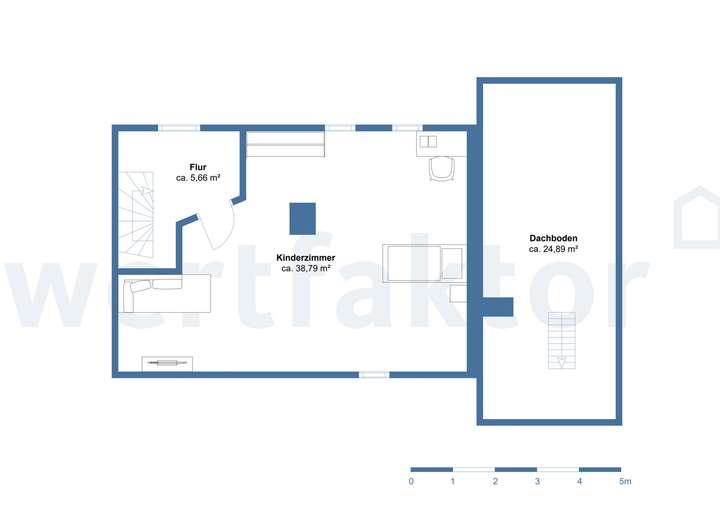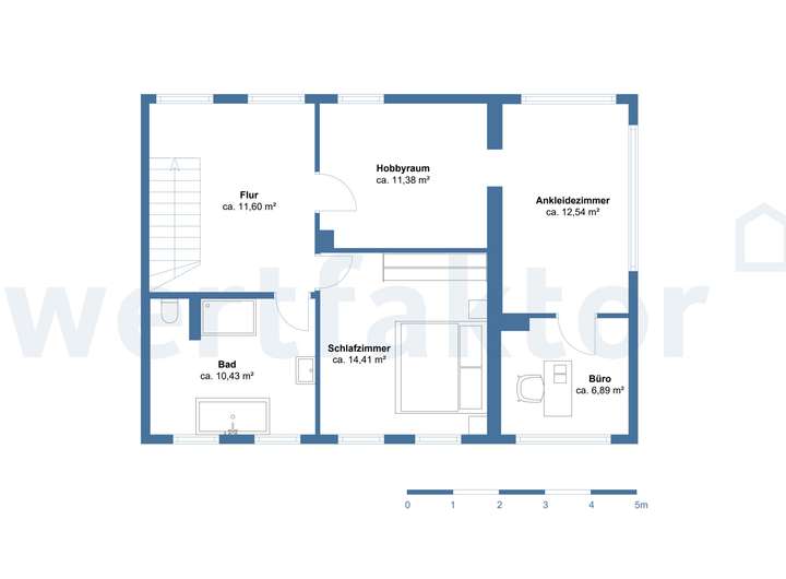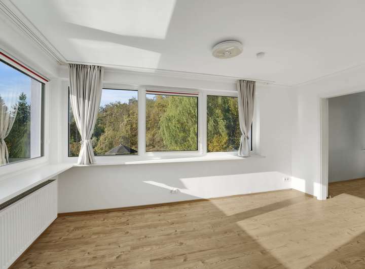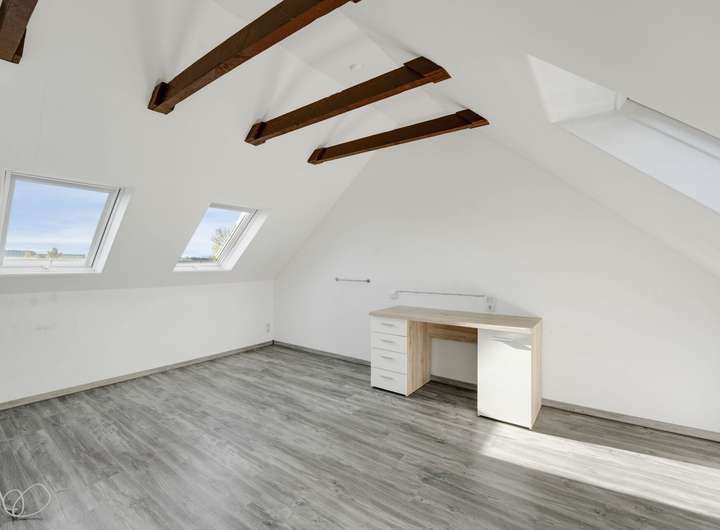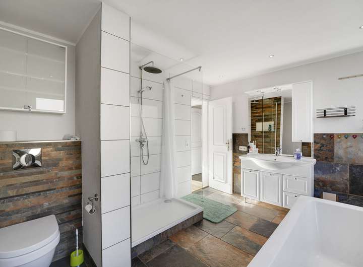 Über eine helle Holztreppe gelangen Sie ins Obergeschoss mit offener Diele, Schlafzimmer, Arbeitszimmer, Ankleide sowie einem stilvollen Badezimmer mit freistehender Badewanne und offener Dusche. Das Dachgeschoss beherbergt das größte Schlafzimmer mit hoher Decke und kaum wahrnehmbaren Schrägen.