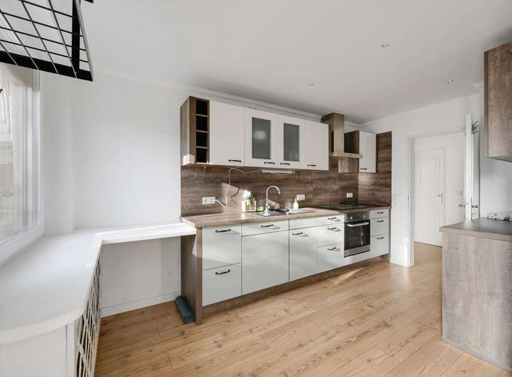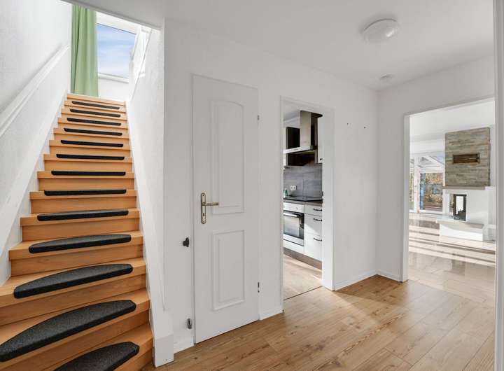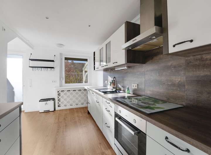 Über einen gepflasterten Zugang erreichen Sie die moderne weiße Haustür mit Fingerabdruckfunktion und Überdachung. Im Inneren empfängt Sie ein heller Holz-Laminatboden mit warmer, einladender Atmosphäre. Im Eingangsbereich befindet sich Platz für die Garderobe, rechts ein Gäste-WC mit Tageslicht. Die gepflegte Küche mit Abstellkammer und hochwertiger Einbauküche verfügt über einen direkten Ausgang zur Terrasse und in den Garten.