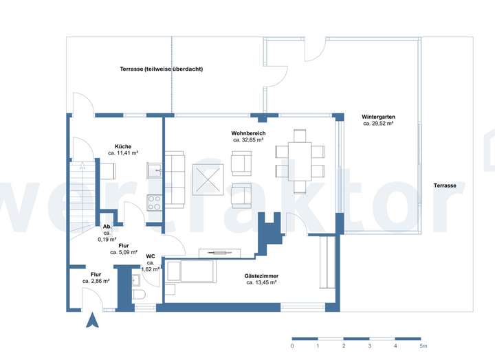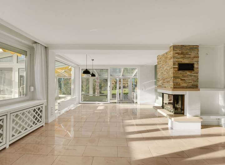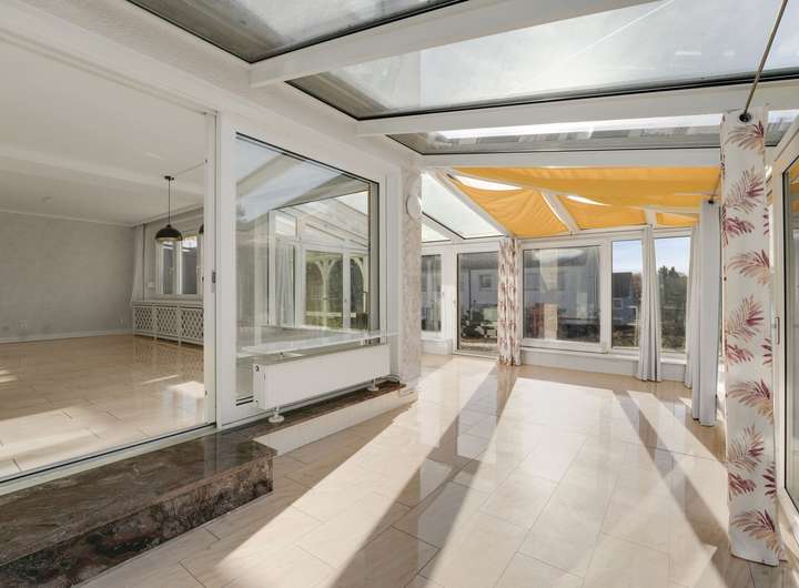 Herzstück des Erdgeschosses ist das großzügige Wohn- und Esszimmer mit offenem Übergang in den lichtdurchfluteten, beheizbaren Wintergarten. Italienischer Marmorfußboden und ein Kaminofen verleihen dem Raum eine besondere Wohnqualität. Ein weiteres Zimmer eignet sich ideal als Gäste- oder Arbeitszimmer. Der L-förmige Wintergarten verfügt über drei Gartenzugänge sowie eine elektrische Markise.