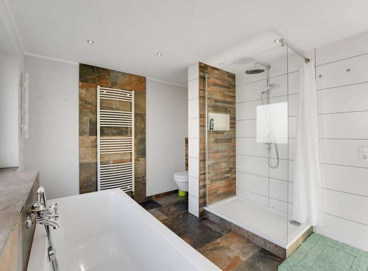 Haustür mit Fingerabdruckfunktion, Italienischer Marmorboden, Kaminofen, beheizter Wintergarten mit elektrischer Markise, gepflegte Einbauküche, Gäste-WC mit Tageslicht, freistehende Badewanne, bodentiefe Dusche, hohe Decken im Dachgeschoss, Sauna, Garten mit Grillofen & Spielbereich