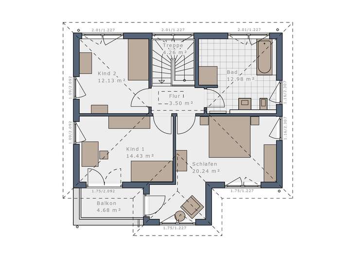 Die dargestellten Grundrisse verstehen sich als Beispiel/Vorschlag und können ohne Mehrkosten individuell umgeplant werden, insofern die Gesamtwohnfläche / bebaute Fläche gleich beleibt. Die Gesamt-Wohnfläche und Hausgeometrie/-Architektur kann gegen Preiskorrektur geändert angeboten werden.
