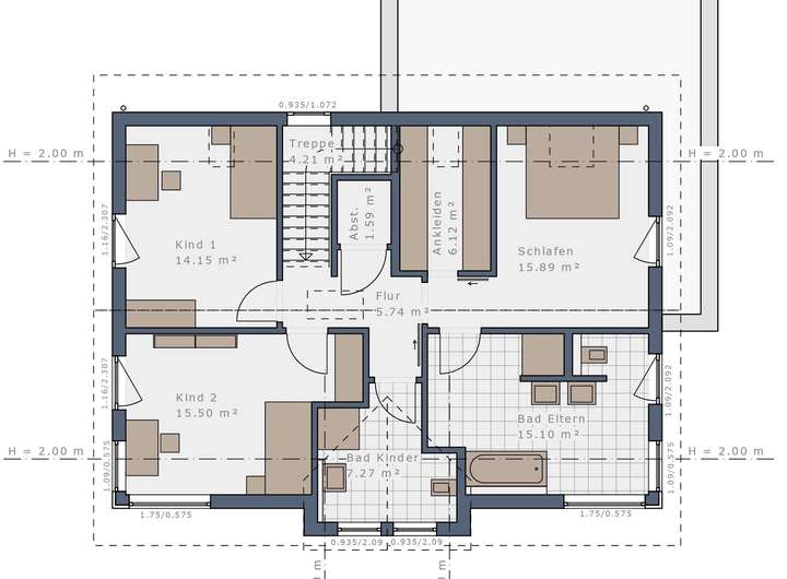 Die dargestellten Grundrisse verstehen sich als Beispiel/Vorschlag und können ohne Mehrkosten individuell umgeplant werden, insofern die Gesamtwohnfläche / bebaute Fläche gleich beleibt. Die Gesamt-Wohnfläche und Hausgeometrie/-Architektur kann gegen Preiskorrektur geändert angeboten werden.