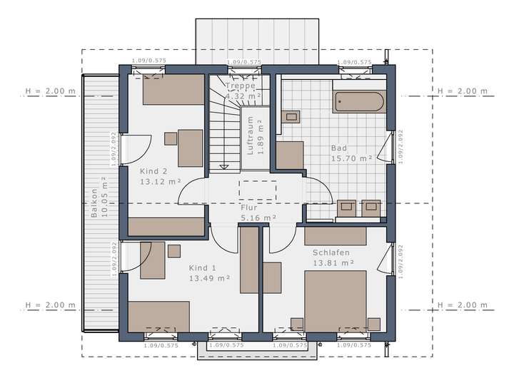 Die dargestellten Grundrisse verstehen sich als Beispiel/Vorschlag und können ohne Mehrkosten individuell umgeplant werden, insofern die Gesamtwohnfläche / bebaute Fläche gleich beleibt. Die Gesamt-Wohnfläche und Hausgeometrie/-Architektur kann gegen Preiskorrektur geändert angeboten werden.