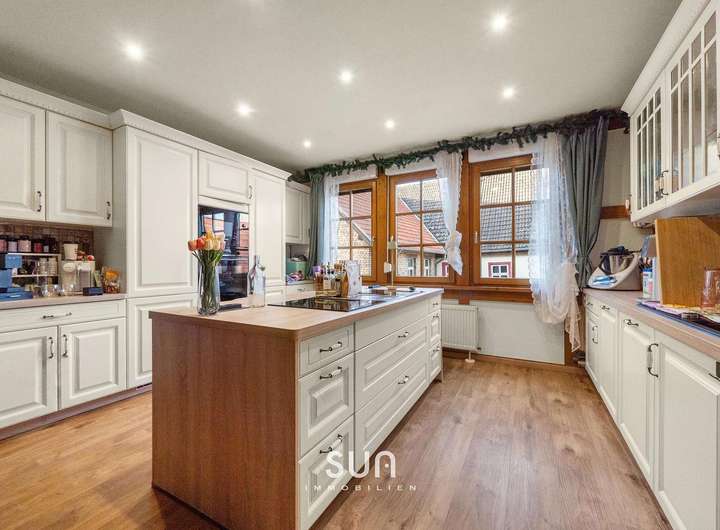 Praktische Nebenflächen wie Abstellräume, Werkstattbereiche, zwei Weinkeller, ein Gäste-WC sowie eine vorhandene Einbauküche ergänzen den hohen Nutzwert des Hauses. Der großzügige Innenhof bietet Platz für 4 bis 6 Fahrzeuge und schafft zugleich eine geschützte, private Hofsituation mit viel Ruhe und Aufenthaltsqualität.