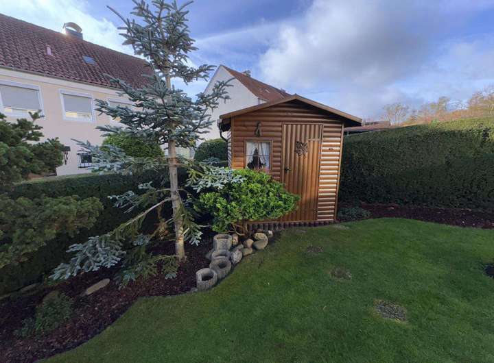 - Gepflegter Garten mit Gartenhäuschen und Sitzgelegenheit