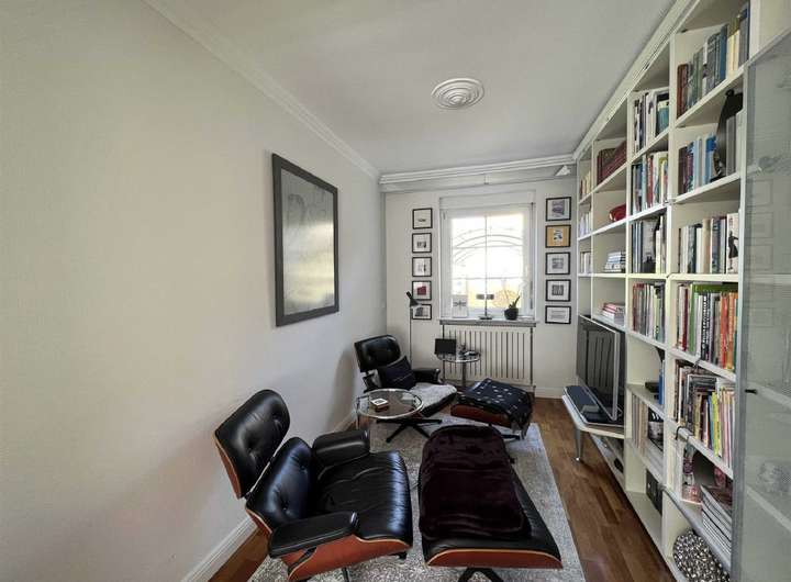 schönes Wohn- und Esszimmer mit Bibliothek, moderne Küche, Gäste-WC und Diele