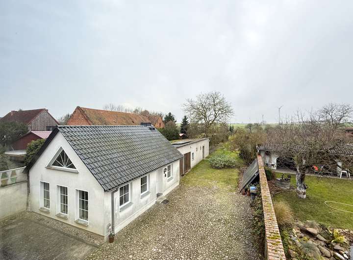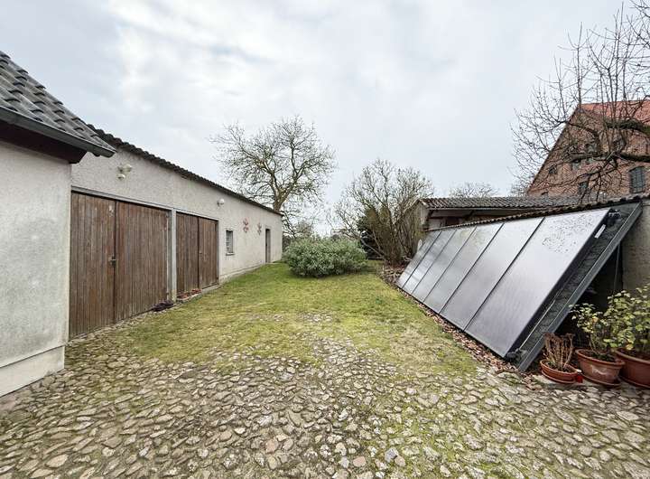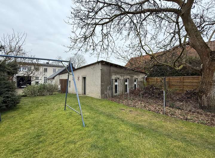Das Grundstück erstreckt sich über ca. 1.717 m² und punktet mit einer gepflasterten Hoffläche, einem vielseitigen Nebengebäude sowie rund 1.000 m² Gartenfläche, die voll umzäunt sind. Obstbaumbestand und eine idyllische Hof-/Gartenatmosphäre bieten Familie und Haustieren ausreichend Freiraum. Im rückwärtigen Anbau befindet sich ein lichtdurchfluteter Partyraum (Umbau ca. 1999) mit Gäste-WC und Küchenzeile. Weiter hinten im ehemaligen Stallgebäude finden Sie eine Garage um Ihren PKW sicher unterzustellen. In der zweiten Garage sind aktuell der Holzvergaserofen und der Pufferspeicher untergebracht. Daneben gibt es eine Werkstatt, einen Hühnerstall mit umzäunten Auslauf – ideal zur vielseitigen Nutzung oder als Ergänzung zu Wohn- und Gemeinschaftsflächen.