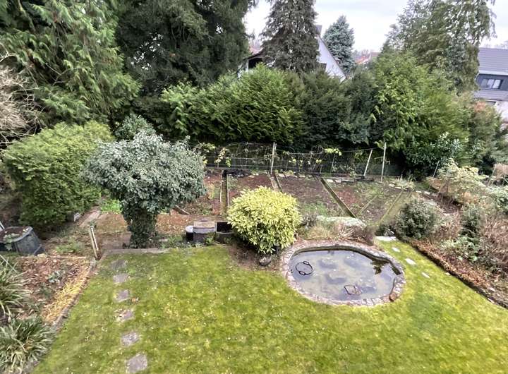 Die Grünanlagen sind sehr gepflegt und machen das Grundstück von hinten nicht einsehbar. Sie lassen sich teilweise durch die vorhandene Beregnungsanlage bewässern. Im Garten befindet sich ein kleiner Fischteich.
