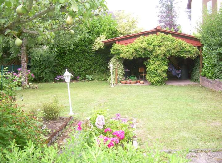 Der schön angelegte Garten mit Gartenhaus läd zum verweilen ein.