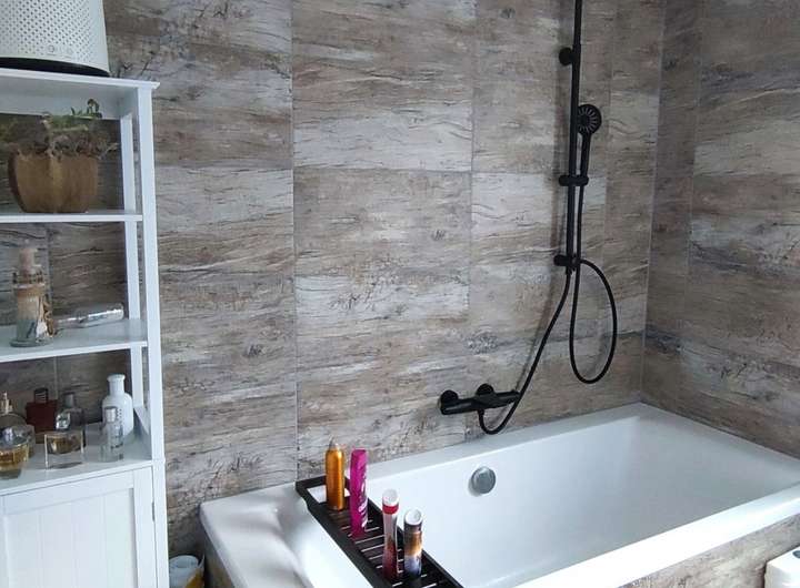 Das Badezimmer verfügt über eine XXL Badewanne, der Duschvorhang ist in der Decke integriert und wird bei Bedarf ein- oder ausgerollt. Die hochwertigen und miteinander harmonierenden Fliesen machen dieses Bad einzigartig.