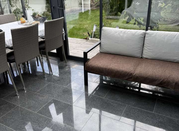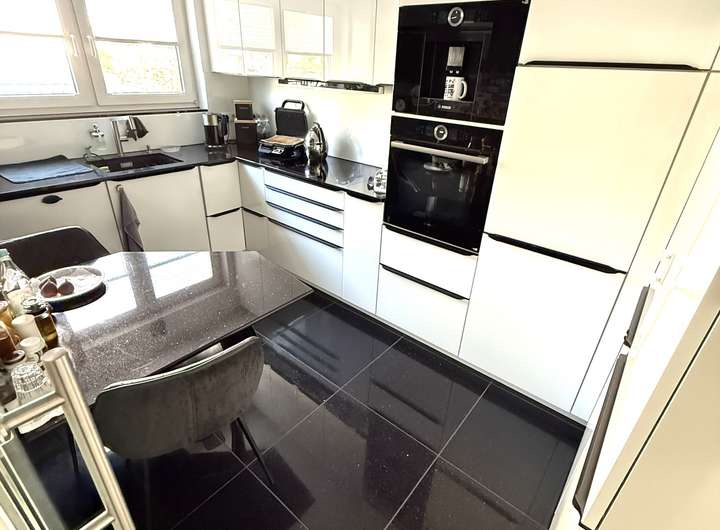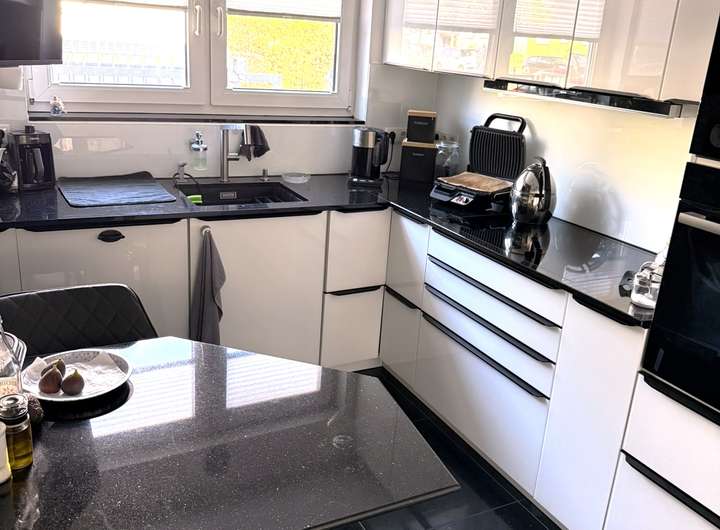 Moderne Einbauküche (2020) mit Granit-Arbeitsplatte und hochwertigen Elektrogeräten