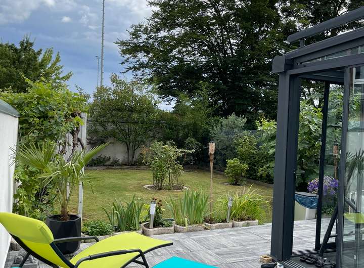 Vom Wintergarten aus gelangen Sie auf die großzügige Terrasse, die zu beiden Seiten ausgerichtet ist und reichlich Platz zum Grillen, Sonnen und Entspannen bietet. Von hier besteht auch ein direkter Zugang zum Abstellraum hinter der Garage.