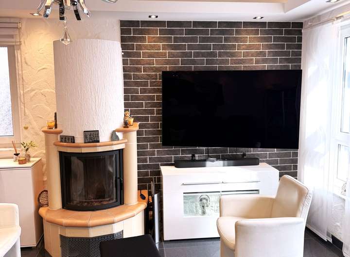 Großes Wohnzimmer mit Kamin und Klimaanlage