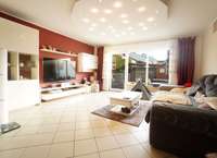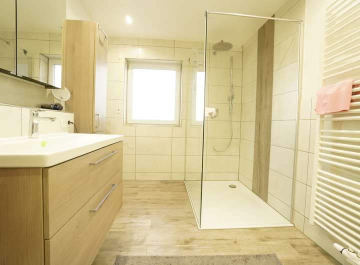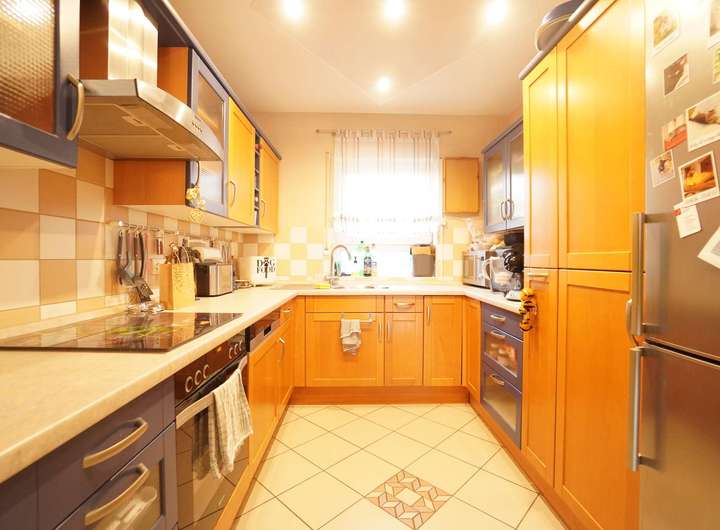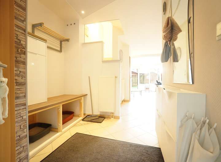 Das Erdgeschoss ist offen und einladend gestaltet. Die offene Küche fügt sich harmonisch in den Wohnbereich ein und schafft eine kommunikative Atmosphäre. Das Wohnzimmer bietet direkten Zugang zur Terrasse sowie in den kleinen, pflegeleichten Garten, der sich als angenehmer Rückzugsort im Freien eignet. Ein Gäste-WC ergänzt diese Ebene sinnvoll.