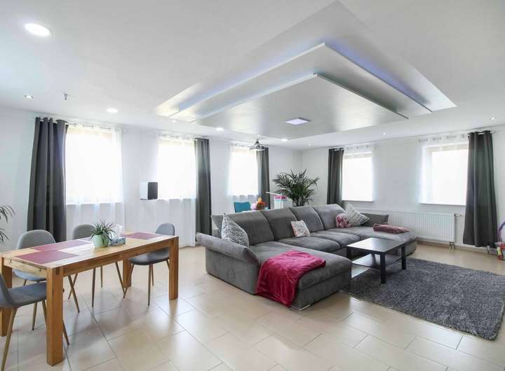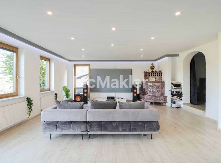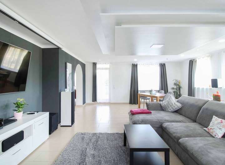 Specials wie eine Leinwand mit Beamer im Wohnzimmer und ein schöner Entspannungsbereich mit gemütlichem Kamin mit Wasserspeicher im Erdgeschoss erwarten Sie. In der Einliegerwohnung befindet sich ein Kachelofen, welcher in 2024 modernisiert wurde.