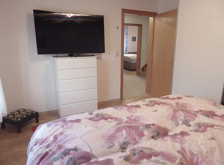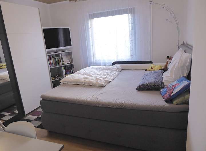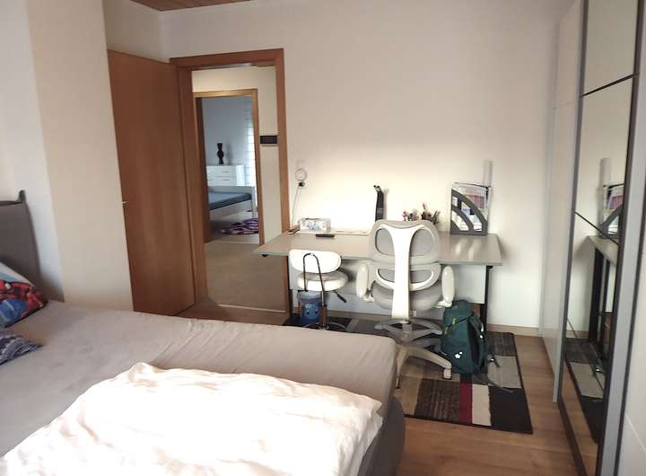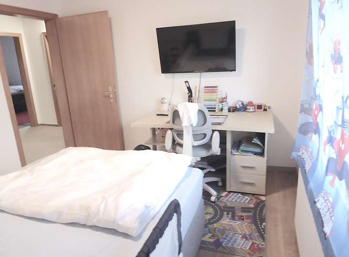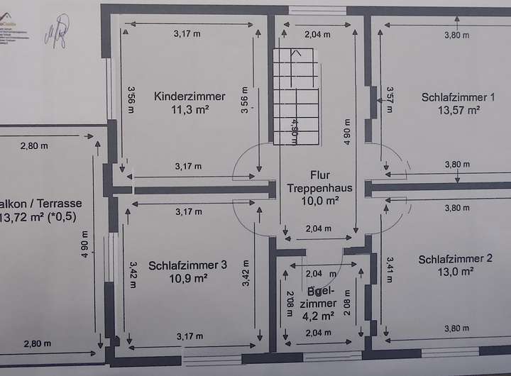 Über die massive Holztreppe gelangen Sie in das Obergeschoss, das als privater Schlafbereich konzipiert ist. Hier erwarten Sie ein geräumiges Schlafzimmer mit 13,57 Quadratmetern sowie drei Kinderzimmer mit Größen von 13, 11,7 und 10,9 Quadratmetern. Eines der Kinderzimmer bietet zudem Zugang zu einem 13,7 Quadratmeter großen Balkon mit östlicher Ausrichtung – ideal für den Morgenkaffee im Sonnenlicht. Ein kleiner Raum mit 4,2 Quadratmetern kann flexibel als Büro, Abstellraum oder Bügelzimmer genutzt werden.